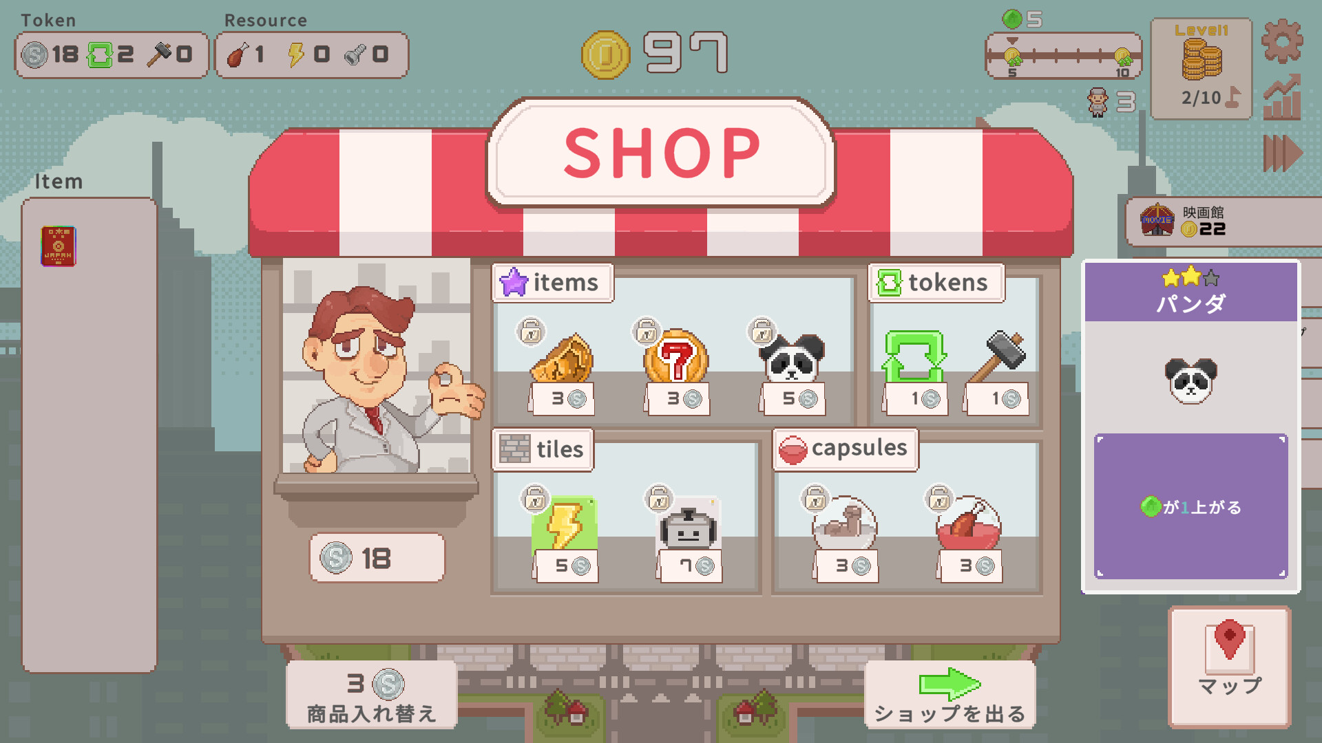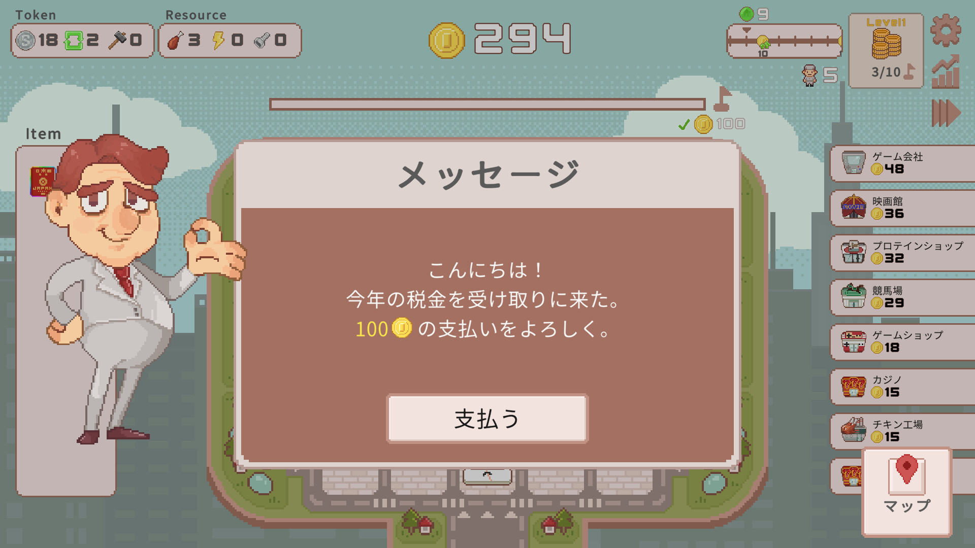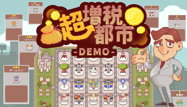 新感覚!?街づくり × ローグライトゲーム『超増税都市』。 ランダムに抽選される施設から、自分好みの施設を選んで配置しよう! 組み合わせは無限大!あなただけの稼げる街を作ろう!