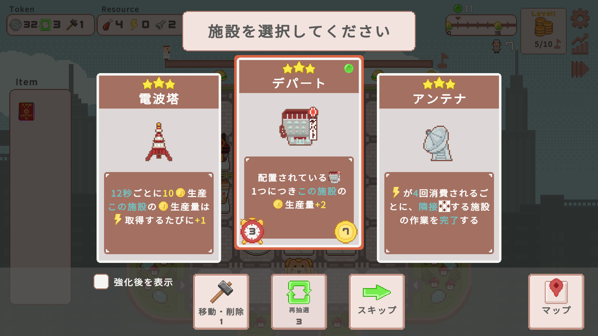 ランダムに抽選される施設から、自分好みの施設を選んで配置しよう!