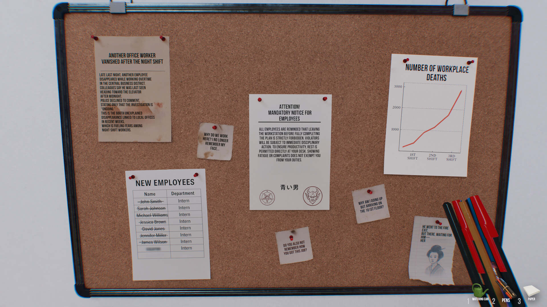 Rumors say people vanish without a trace in this corporation’s offices. Newspapers report hundreds of disappearances—employees seem to dissolve after night shifts, and the last time they’re seen alive, they’re heading to the elevator after midnight. The police refuse to comment, saying “the investigation is ongoing.”