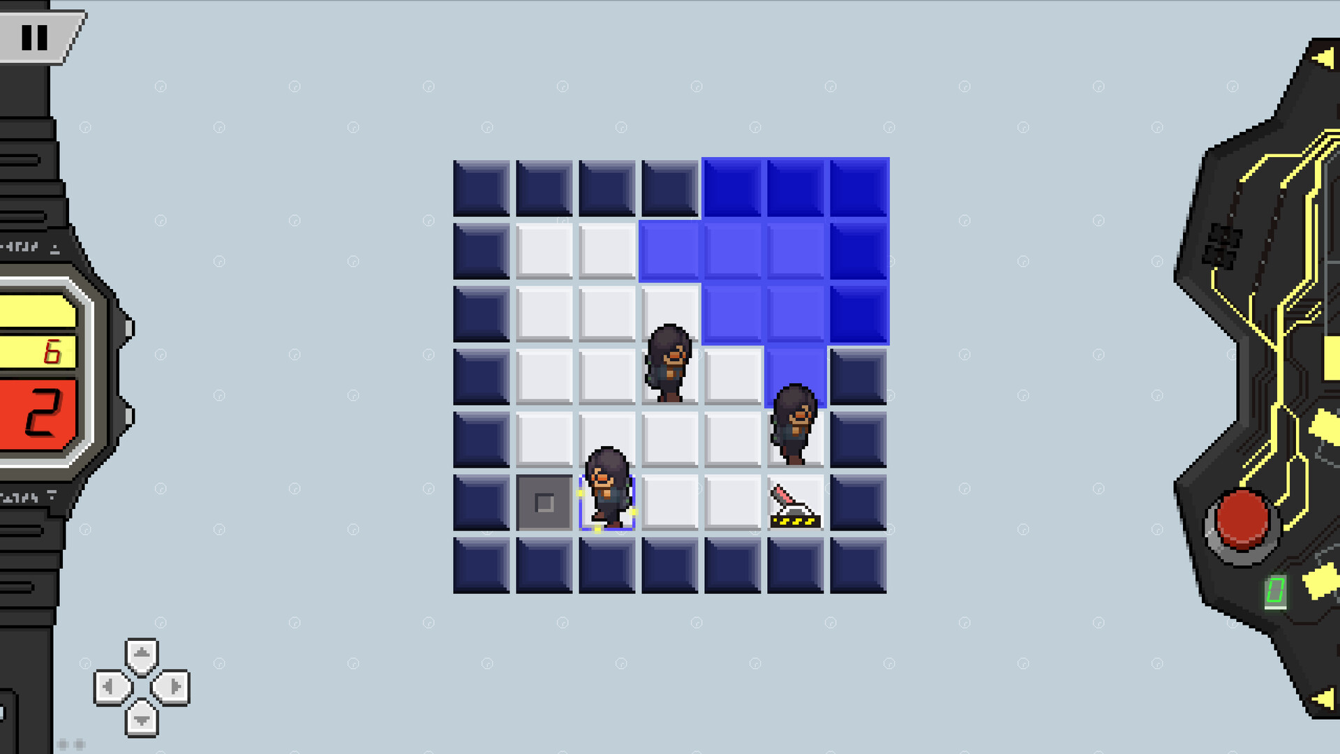 Activate the switches and reach the exit before the time is up. Each move costs 1 second. The time limit is indicated by the watch. Leap into to past to succeed.