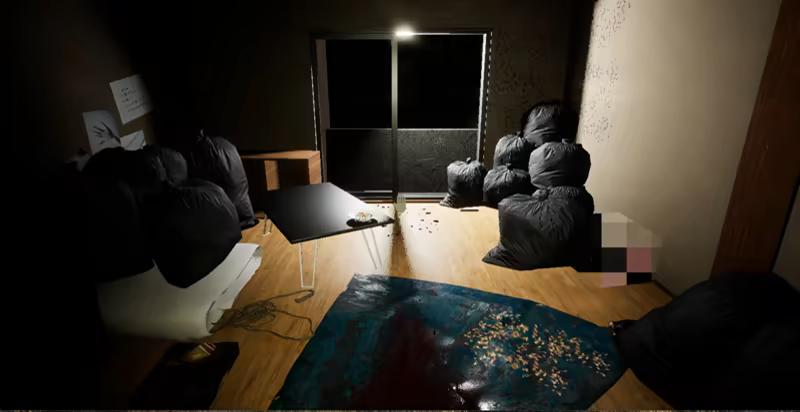 The protagonist, who has taken a job as a special cleaner, goes to his first cleaning site with his seniors.