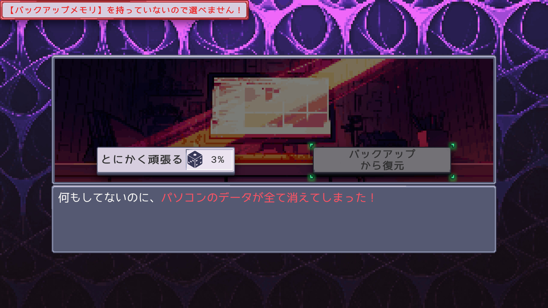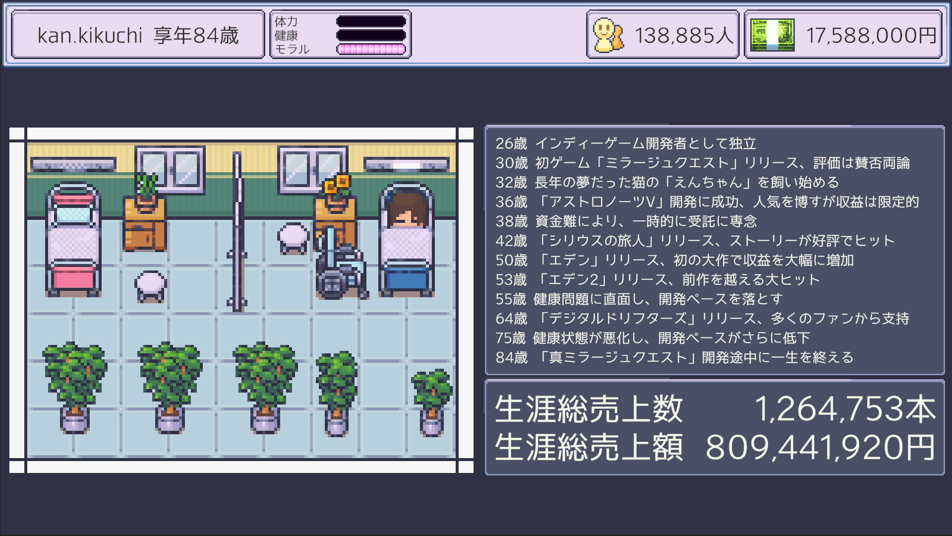 「好きな時間に、好きなゲームを作って、好きな事だけして生きていく」 そんな人生を夢見て独立した個人ゲーム開発者が、お金と時間に悩まされながら死ぬまで税金を払わされるリアル指向の人生シミュレーションゲームです。 この生き方が幸せなのか、本当に孤独なのか、それを決めるのは自分自身。