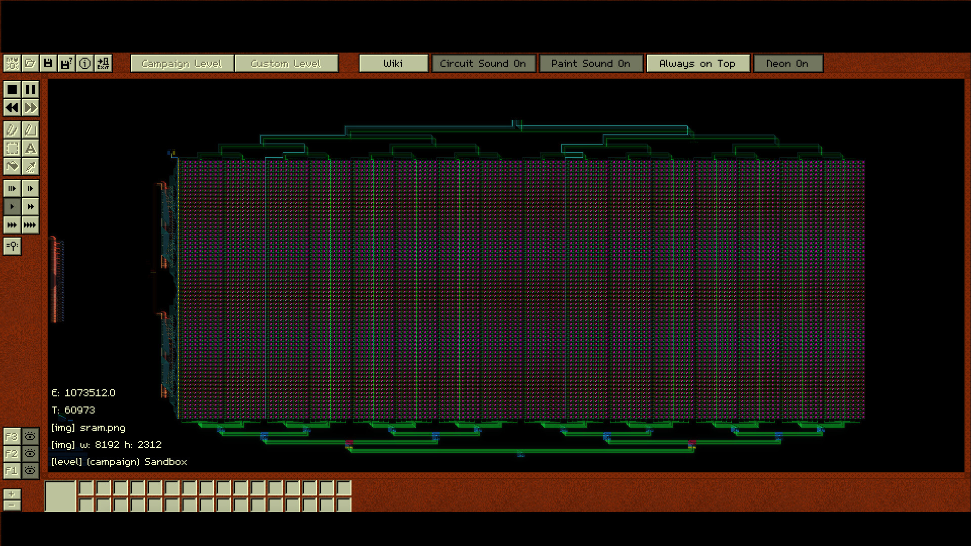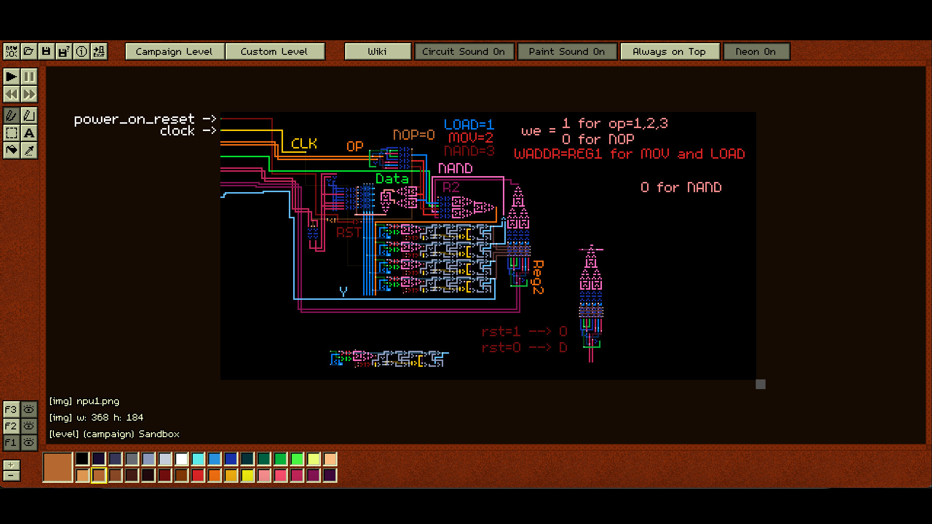 Draw pixels like MS Paint — but each pixel is a wire or gate. From simple NAND gates you can build: