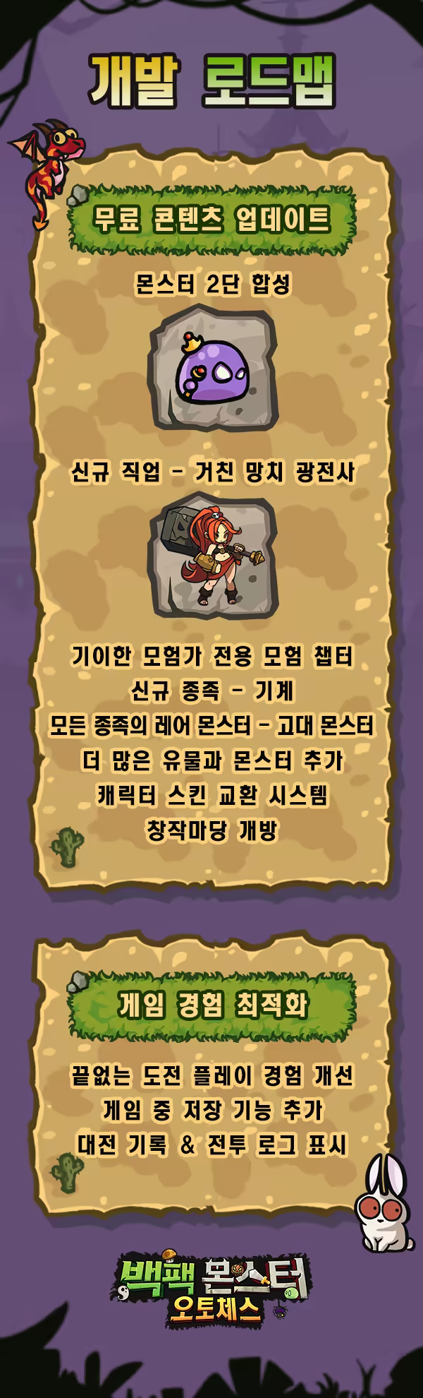 《백팩 몬스터》에서 몬스터 팀을 소집해 상대를 물리치세요! 이 백팩 관리 오토체스 게임에서는 몬스터를 수집하고, 조합하며, 배치합니다. 같은 종족 간의 강력한 시너지 효과와 다양한 몬스터 간의 융합 및 진화를 통해 더 많은 가능성을 탐구하고 최강의 팀을 만들어 보세요!