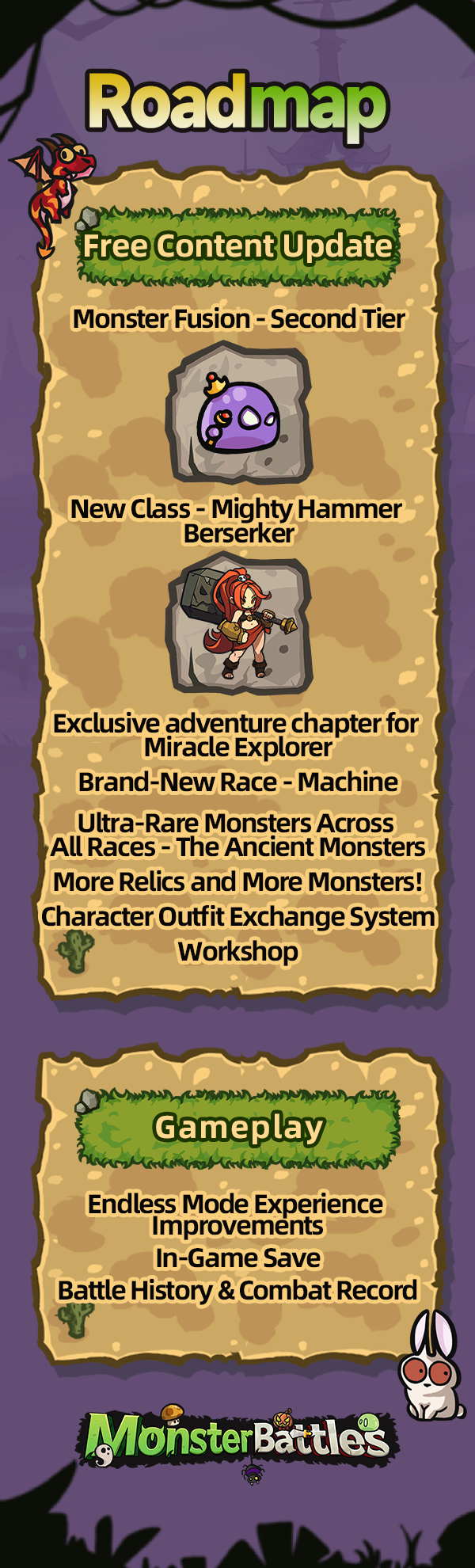 Monsters will have different races, shapes, sizes, and rarity. The correct combination and distribution of them are the key to enhancing combat power!