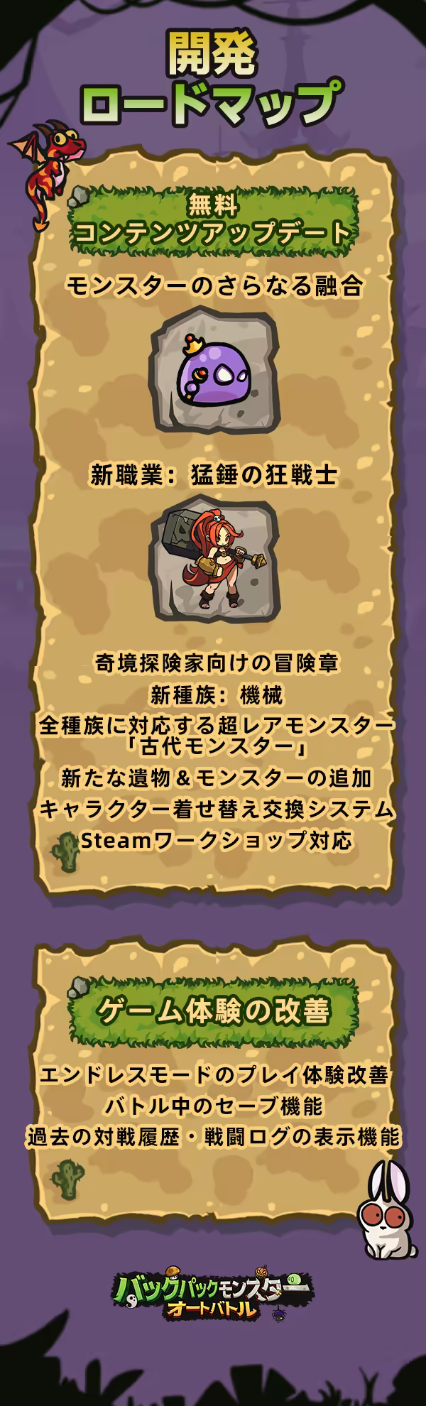 『バックパックモンスター』の世界には、アンデッド、ビースト、亡霊、そして謎のたまごなど、さまざまな生物が存在します。同じ種族のモンスターを編成することで、より強力な力を発揮します。新たな組み合わせを発見し、あなたの最強チームを目指しましょう!