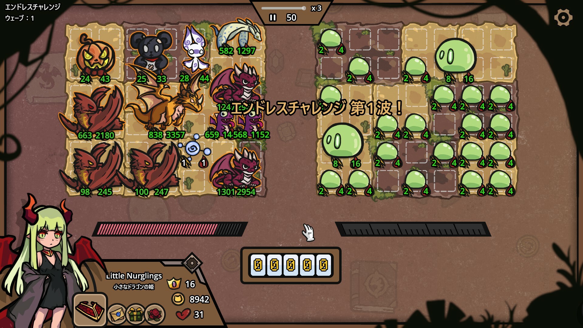 異なるモンスター同士を融合させることで進化が可能です。組み合わせを活用すれば、次のターンで進化が完了し、さらに強力なモンスターへと成長します。究極モンスターを生み出して戦場を席巻しましょう!