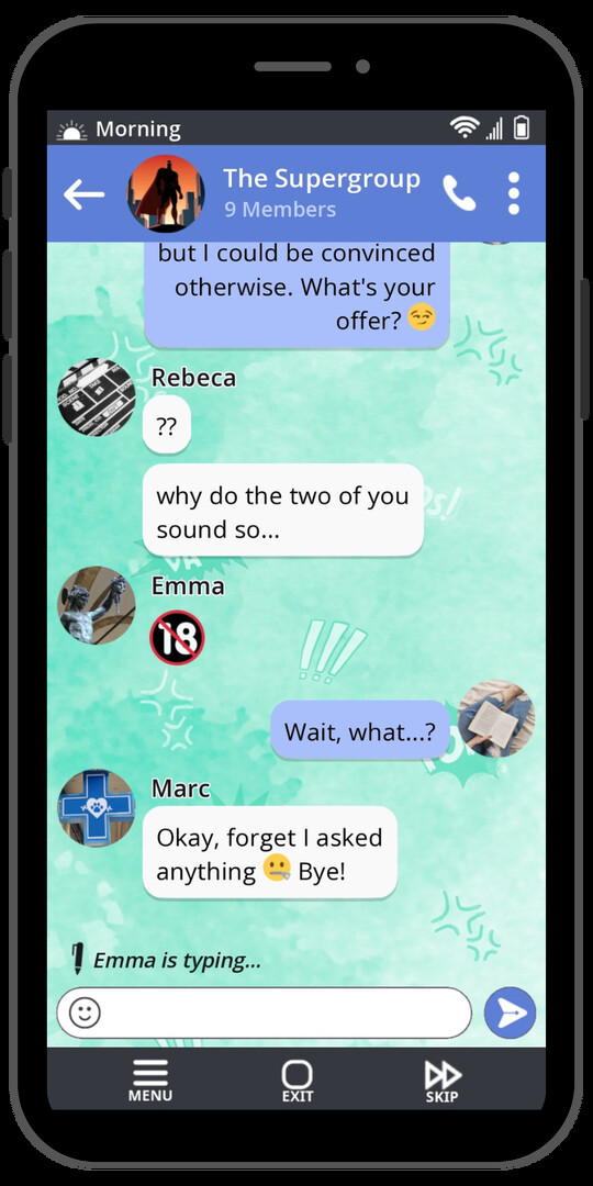 -Play as if it were a real messaging app. Chat, receive and make calls, browse the profiles of your contacts...