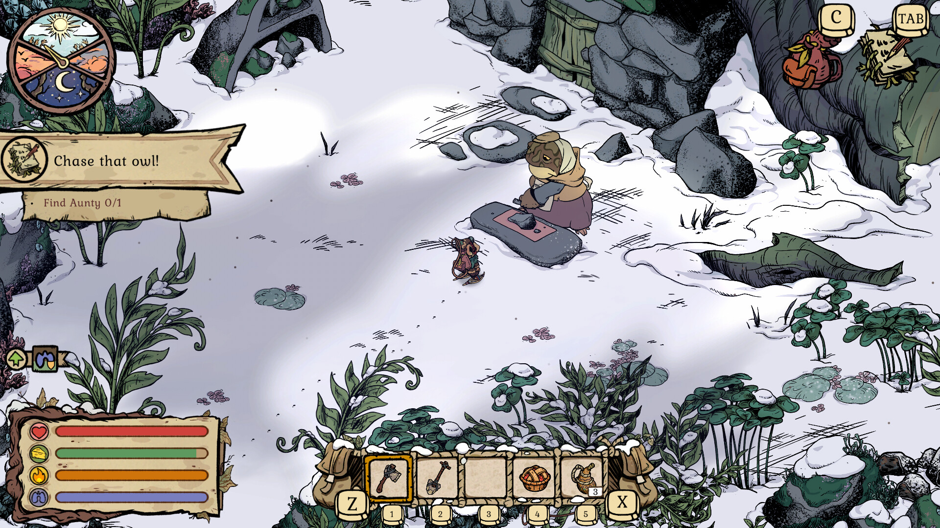In Winter Burrow, you play a mouse who returns from the big city to find their childhood home in ruins. To make matters worse, your Aunt (who was supposed to be looking after it) has gone missing. Restore your broken-down childhood burrow to its former glory so you can relax in front of the fireplace.
