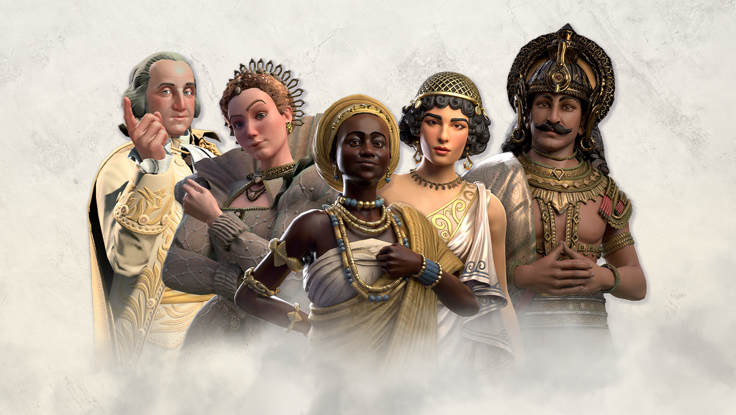 Enhance five Ara: History Untold Leaders (Ashoka, Elizabeth I, George Washington, Sappho and Yaa) with the Gilded Leader Skin Set, featuring golden versions of their in-game costumes.