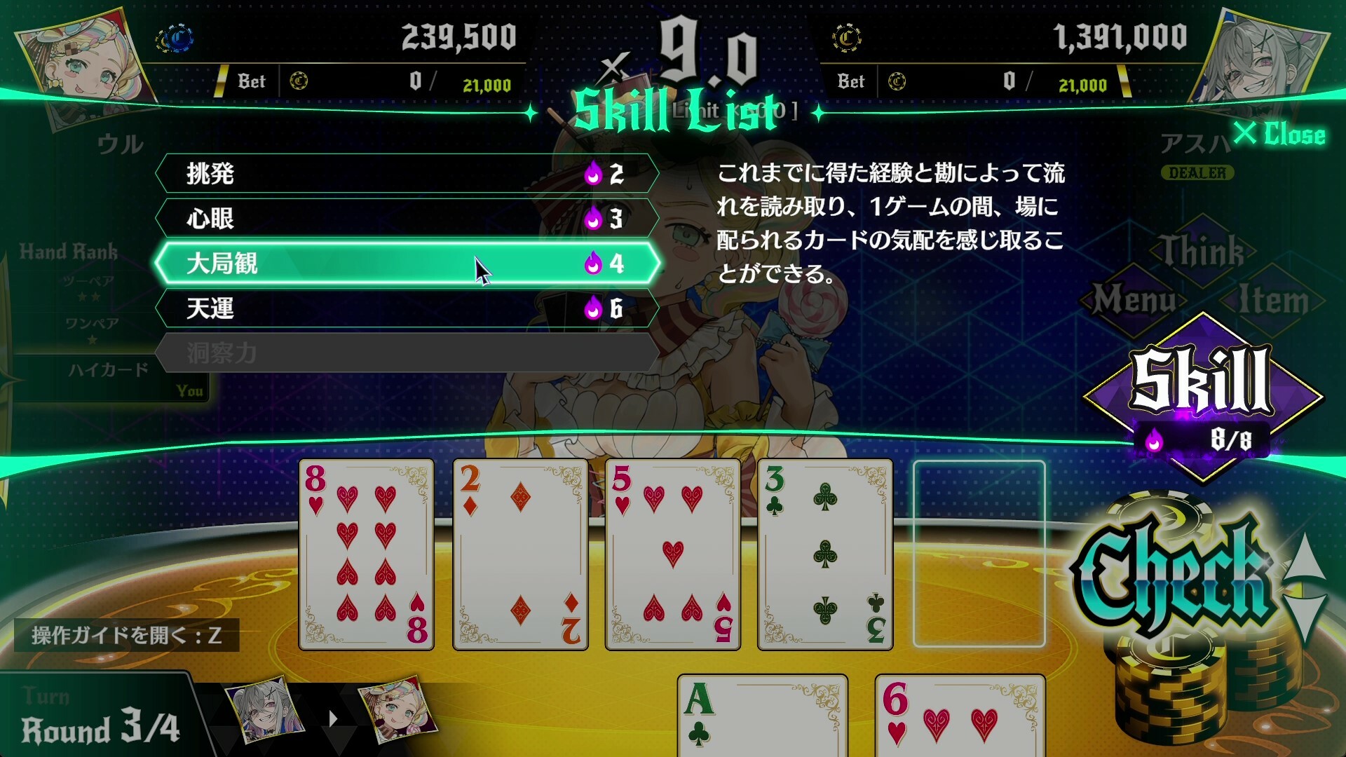 スキルを使うと、ポーカーの手役を制御したり、相手の手札を看破したり、
