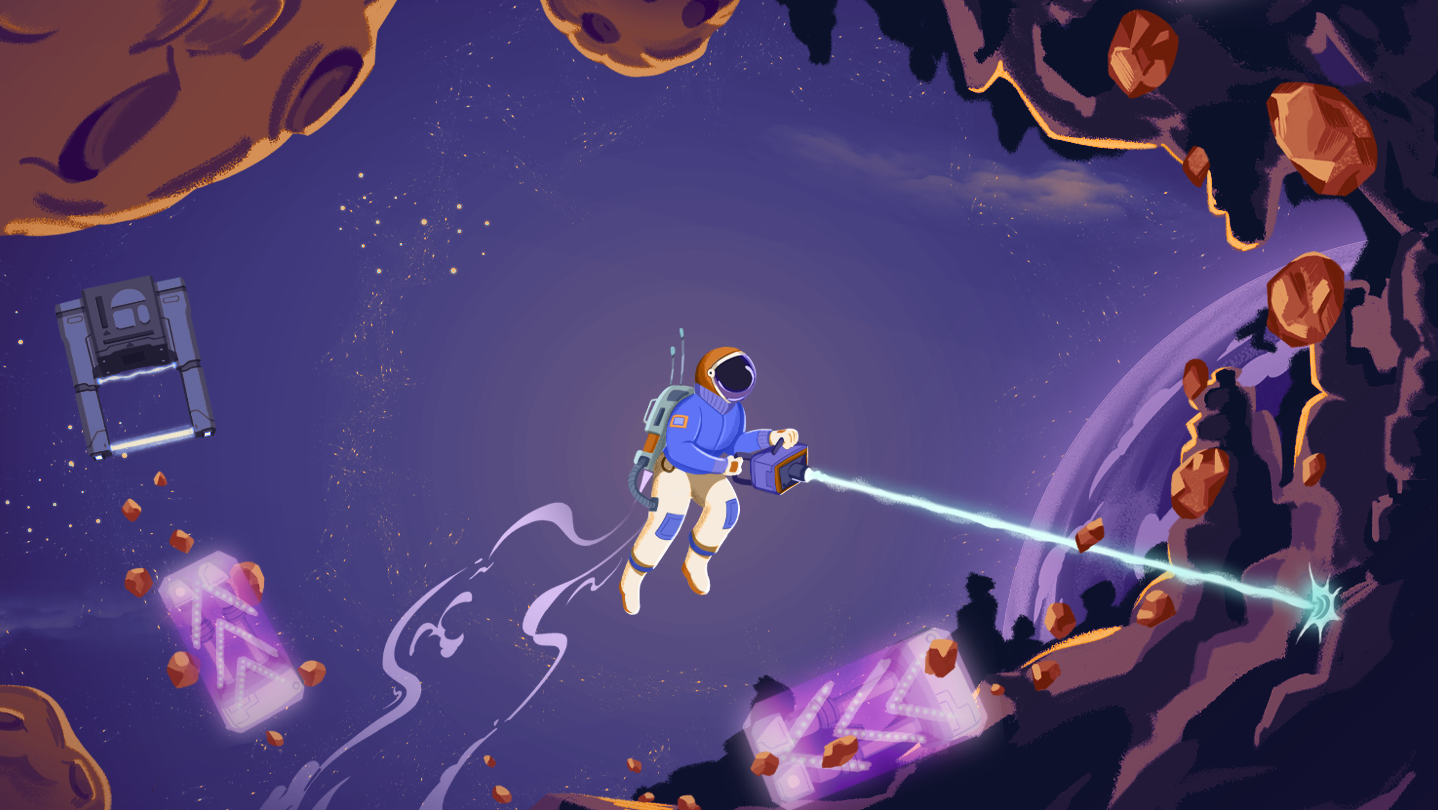 All mining and logistics happen in zero-g! Use your laser and vacuum to break rock and collect resources by hand or engineer systems that carry floaters back to base without you lifting a finger.