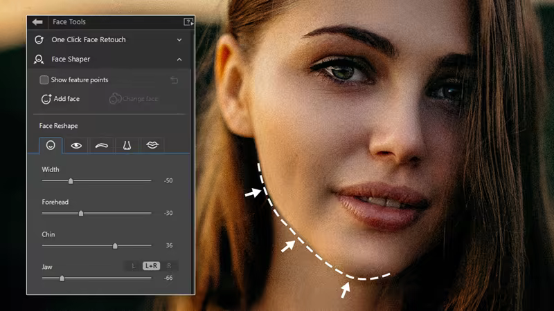 Virtually reshape and refine your face. Remove wrinkles and shine, or whiten teeth. Change the width of the face. Reduce or enhance forehead, jaw, and chin details with shaper tools.
