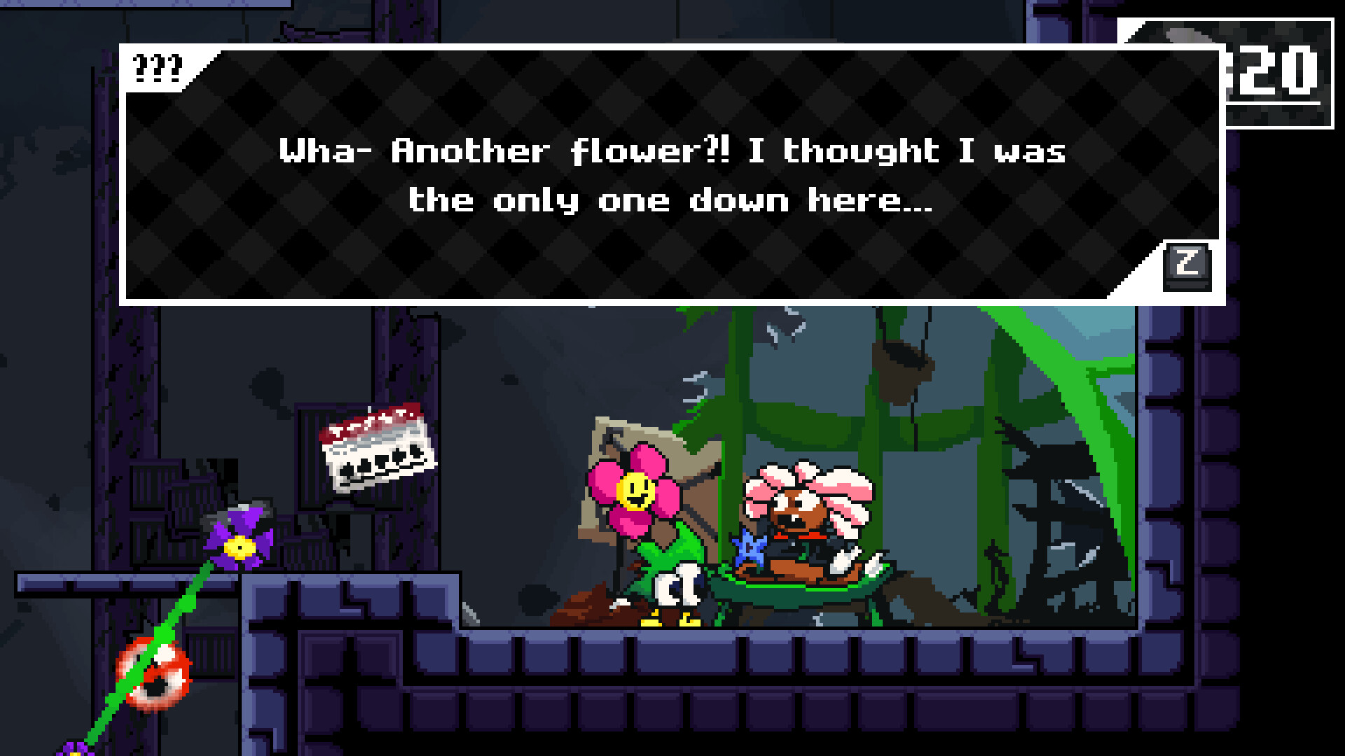 One day, the two awaken from a vase into the depths of a long abandoned laboratory, the Testing Grounds, and together they set out to find a way to the surface. Along the journey they'll meet "helpful" allies like the shopkeeper Daisy, a Gerbera Daisy that can teach Tulip to change the colors of his petal for the price of a handful tasty crystals, and great dangers like the giant worm rumored to target anything that moves around the depths.