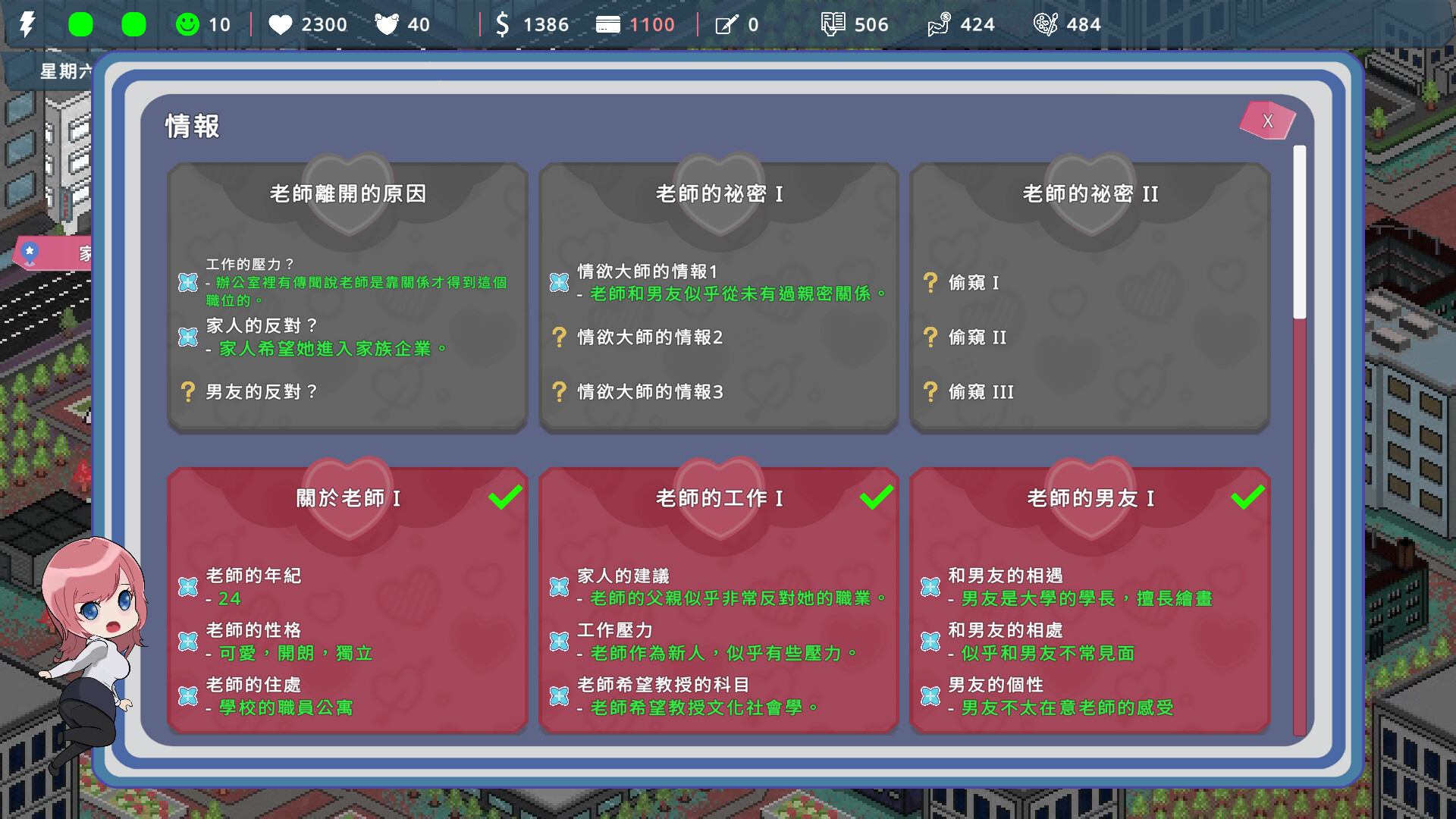 調查老師的作息、製造與老師的偶遇!身為學科全掛的學生,你每週還有固定的房租及信用卡費需要繳交,為了讓老師刮目相看更是需要好好安排鍛煉,學習及補考!努力在畢業前夕讓令你魂牽夢縈的美麗女教師,離開她的男友成為你的戀人,抑或是…