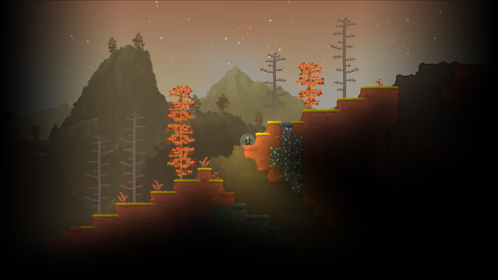 Procedurally generated world: Major areas locations are specific to benefit from a logical game progression, but detailed layout of surface, caverns, ores, etc. are unique at each playthrough.