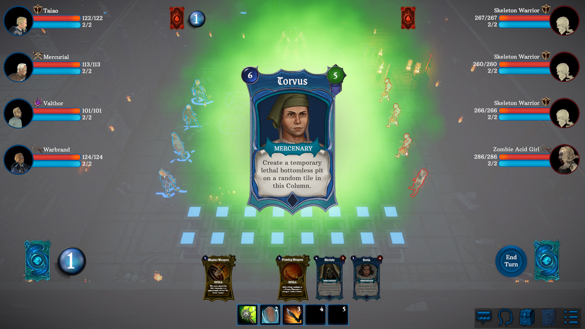Your mercenaries wield swords, bows, and spells through traditional RPG abilities with additional buffs coming from the cards in your hand.