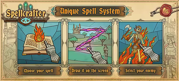 The unique feature of Spellcrafter is the spell casting system. The game recognizes the sign you draw on the screen and automatically chooses the appropriate spell from the spellbook. If you don’t remember the correct sign you are able to consult the spellbook, but beware! Reaching for the spellbook takes additional time and the quicker you cast your spell, the more powerful it will be!