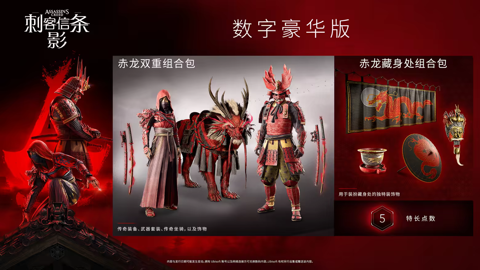 - 赤龙双重组合包,内含奈绪江与弥助使用的装备与武器套装、赤龙兽坐骑,以及赤龙利齿饰物
