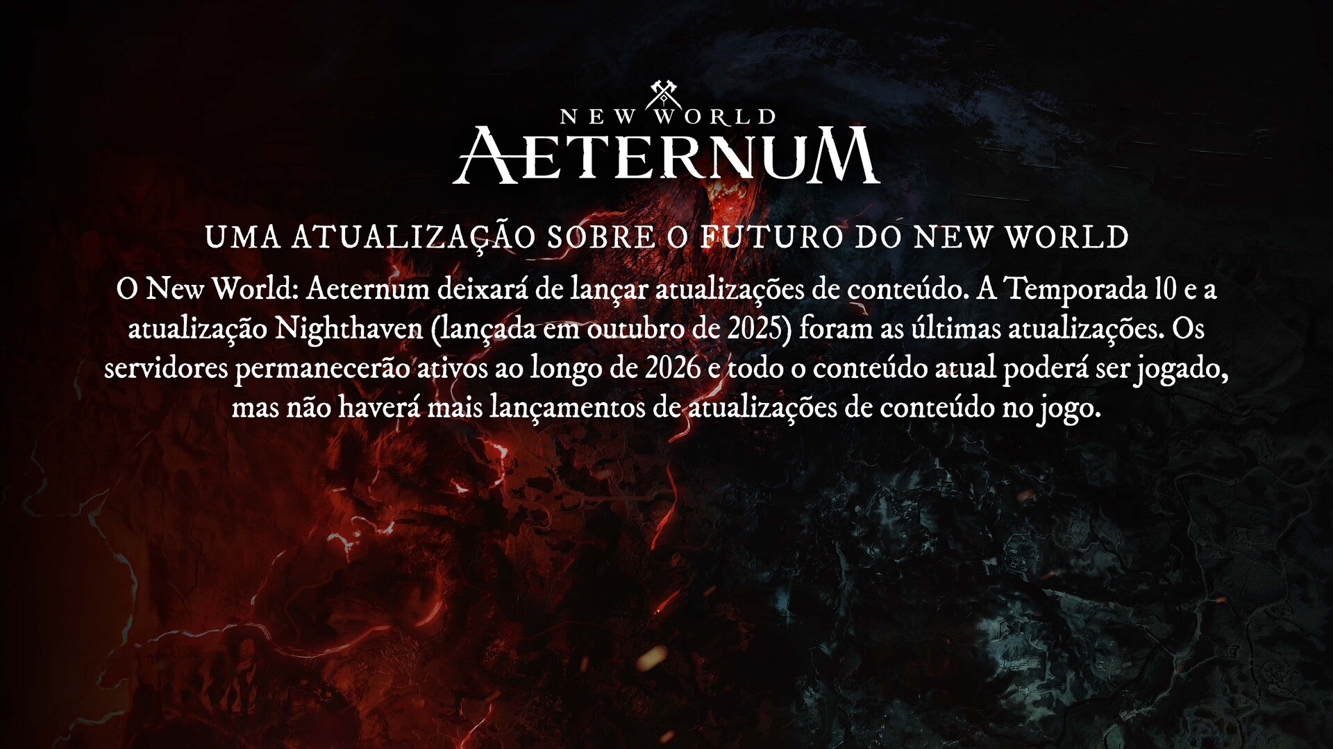 O New World: Aeternum deixará de lançar atualizações de conteúdo. A Temporada 10 e a atualização Nighthaven (lançada em outubro de 2025) foram as últimas atualizações. Os servidores permanecerão ativos ao longo de 2026 e todo o conteúdo atual poderá ser jogado, mas não haverá mais lançamentos de atualizações de conteúdo no jogo.