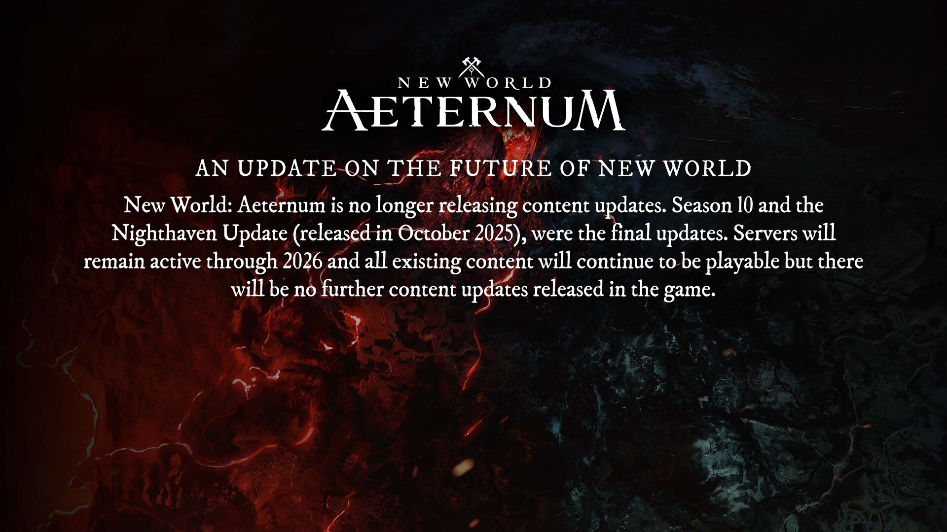 New World: Aeternum is no longer releasing content updates. Season 10 and the Nighthaven Update (released in October 2025), were the final updates. Servers will remain active through 2026 and all existing content will continue to be playable but there will be no further content updates released in the game.