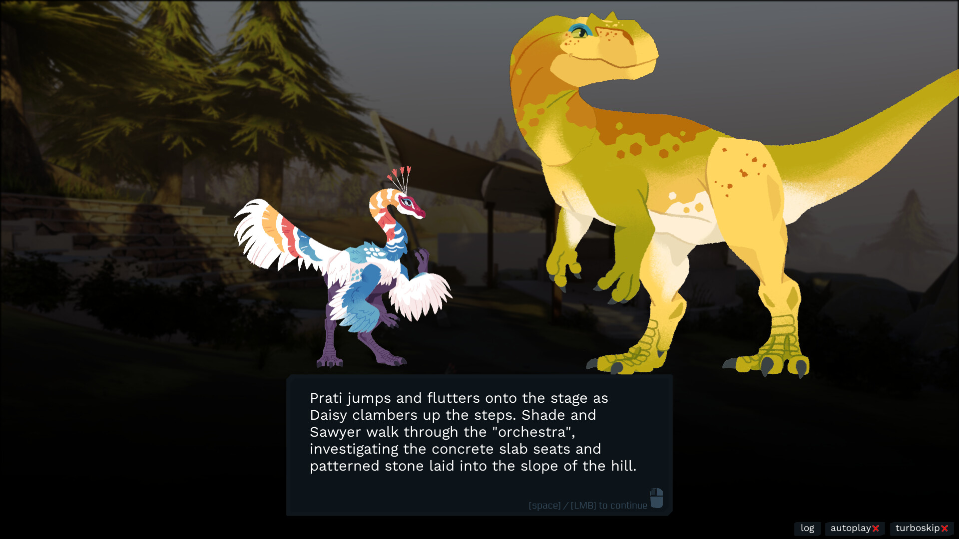 Wander through a long-abandoned campsite and crumbling public spaces. As you explore, the dinosaurs will remark upon the strange human things they find in visual novel events. As the story progresses, new sections of the map become available for exploration and new interactions are possible.