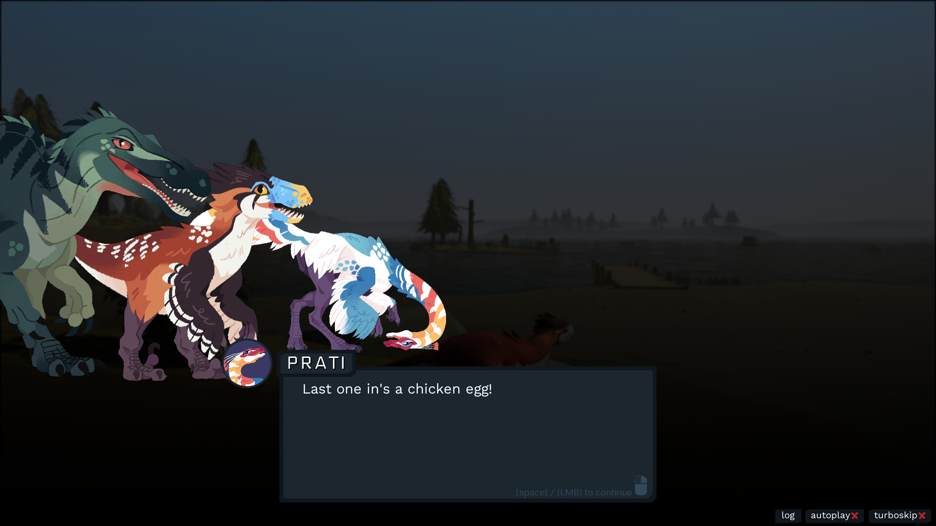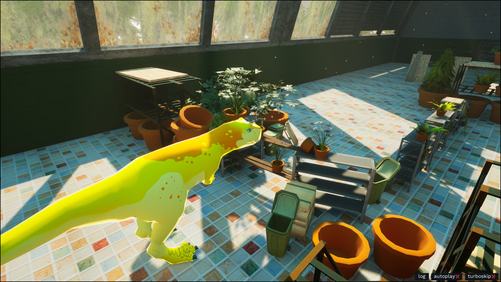 Wander through a long-abandoned campsite and crumbling public spaces. As you explore, the dinosaurs will remark upon the strange human things they find in visual novel events. As the story progresses, new sections of the map become available for exploration and new interactions are possible.