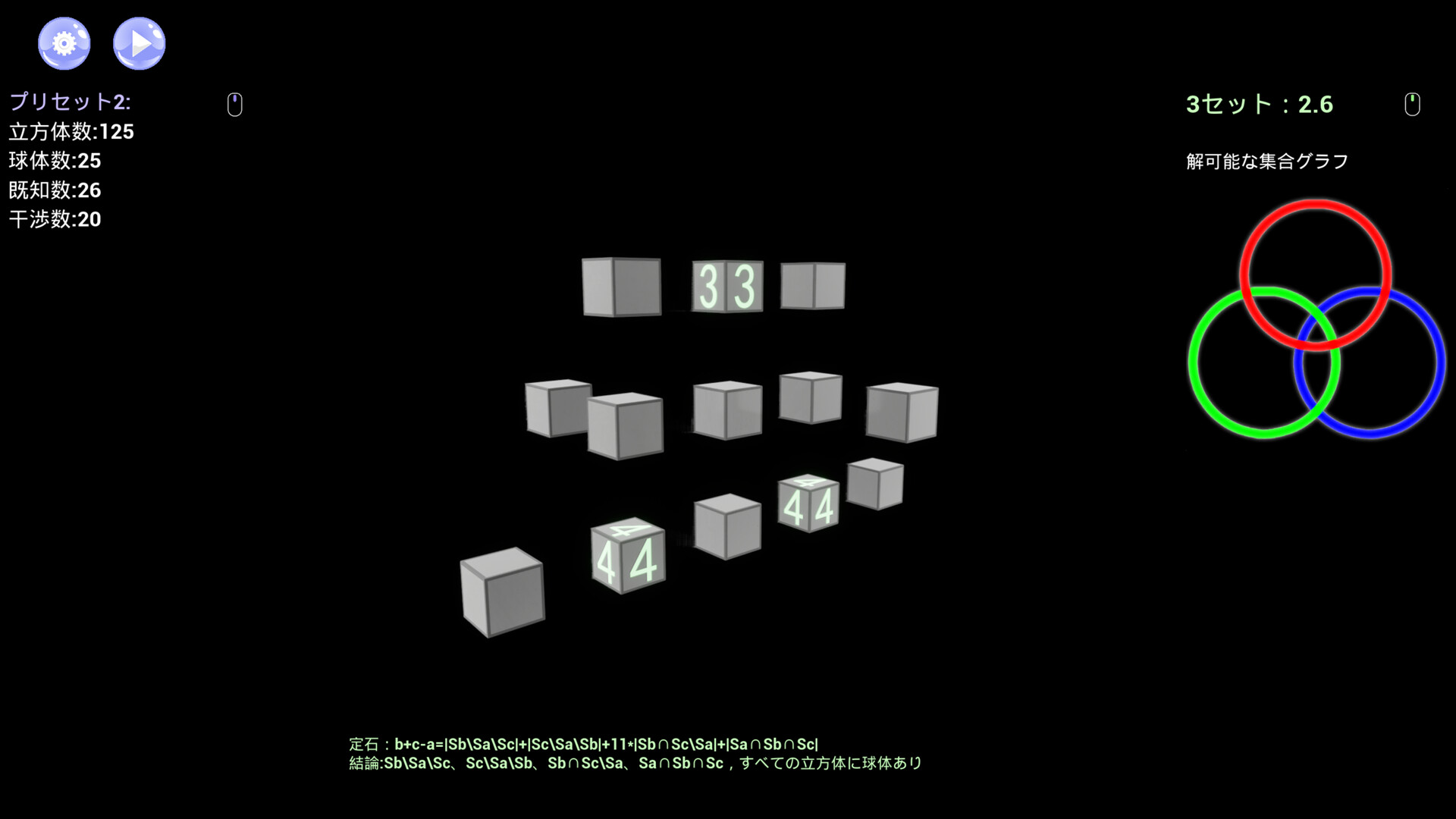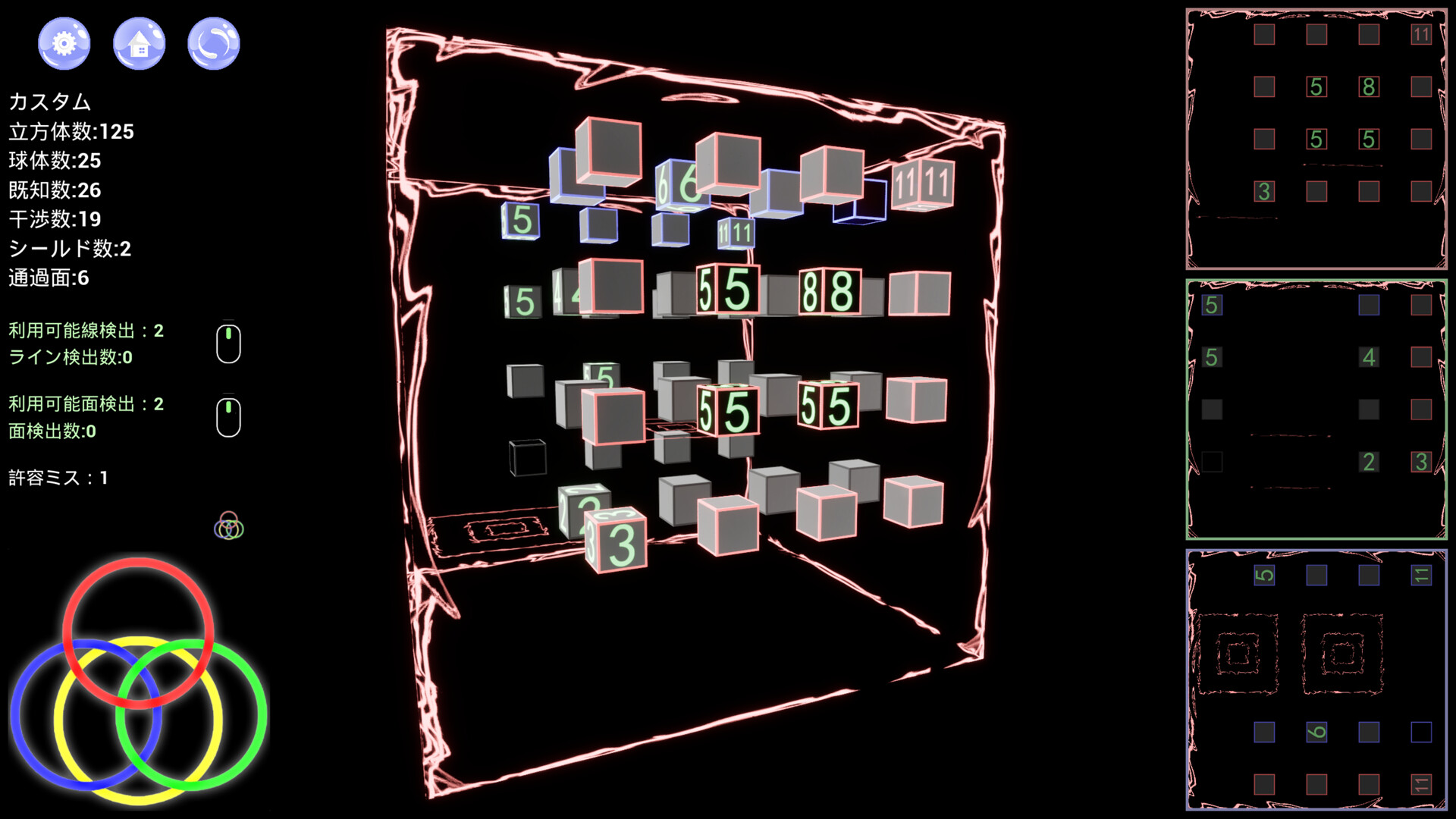基本ルール:球体は立方体の内部に存在し、立方体は検出エリア内の最大27個の立方体(自身を含む)に存在する球体の数を表示します。球体のない立方体は数字を緑色で表示し、球体のある立方体は数字を赤色で表示します。