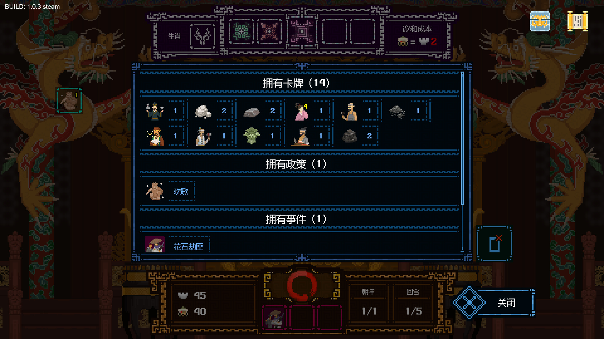 这是一款肉鸽卡牌筑造游戏。 在这片江山下,皇上需通过选择各式卡牌加入牌组,用英明的决策应对不同年份和朝变而造成的影响。不断增强国力,维护国朝安邦,抵御外敌入侵。 江山如此多娇,但是非福祸也很多...愿皇上一路buff叠满,国祚绵延,万世千秋。
