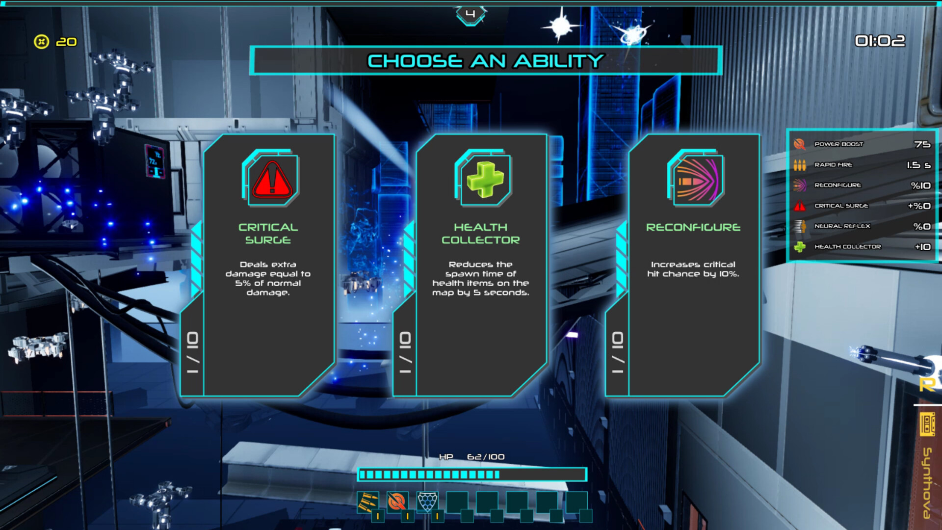 Defeat enemies to unlock powerful upgrades. Engulf foes in a wall of flames, disrupt their systems with a hack wave, or set a laser trap to outsmart them – craft your own combat style!