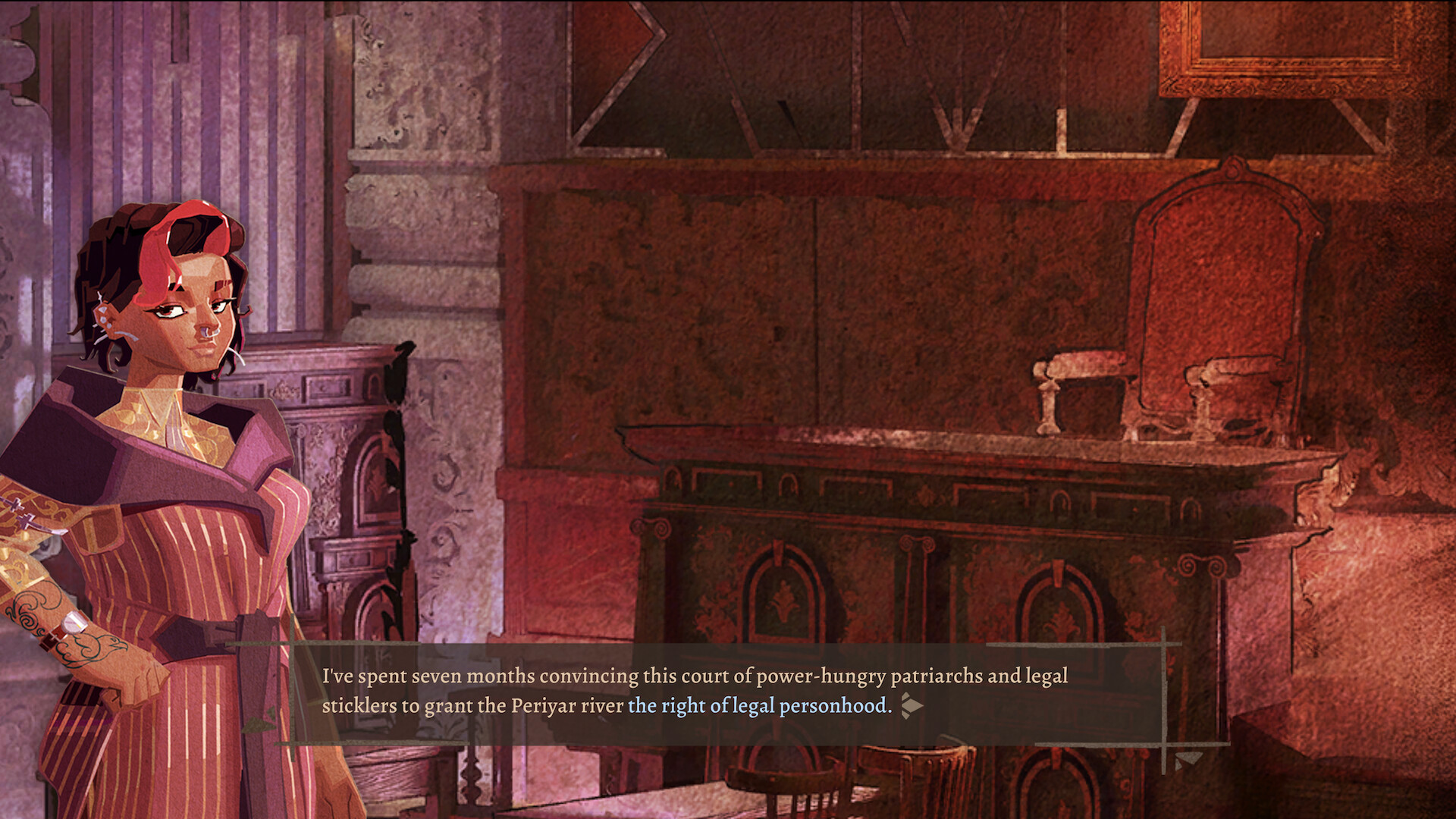 Obey a dead river god’s summons – or defy them. Pass information to violent ecoterrorists – or maintain your pacifist ideals. Convince a corporate stooge to testify for you – or blackmail him with sensitive information. Your choices will determine the fate of Muziris.