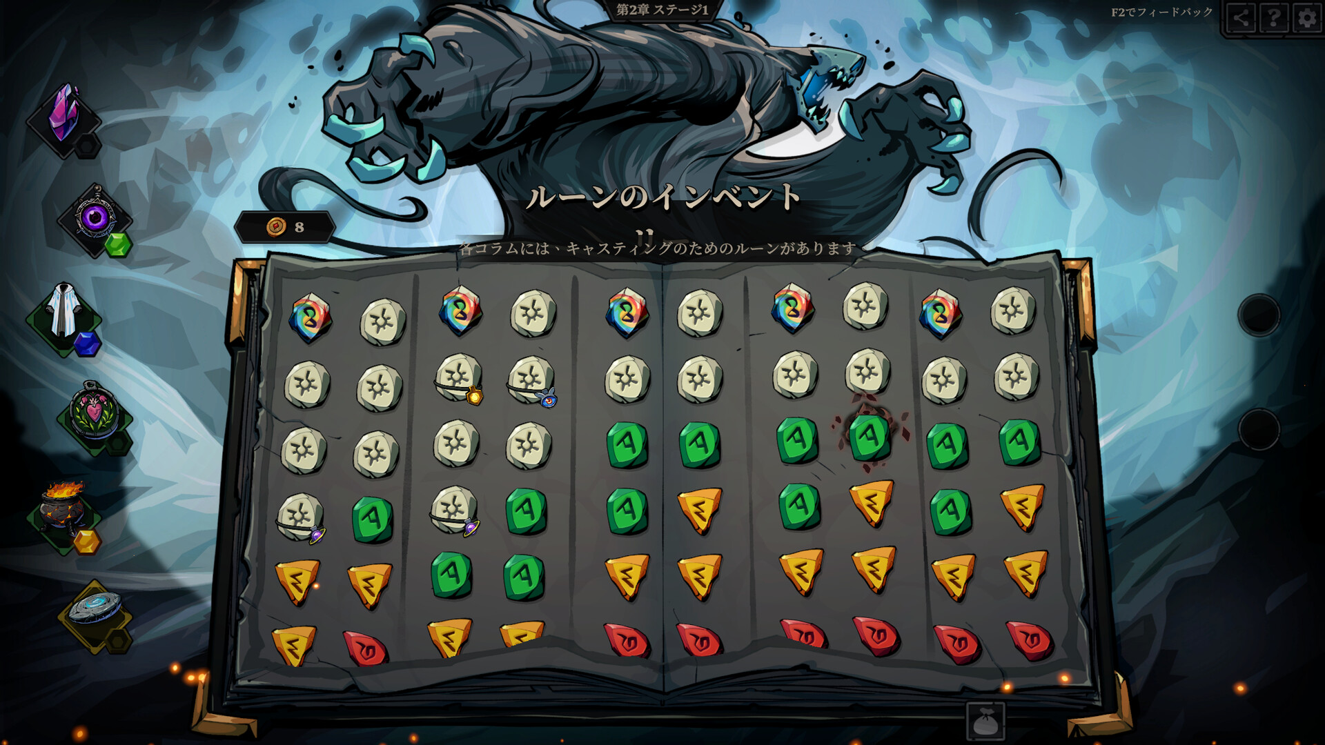 魔法のスロットを動かすように、ルーンのキープやもう一度ランダムに配置するなどの方法を駆使して、できるだけ同じ元素のルーンをつなげ、大ダメージを与えましょう。