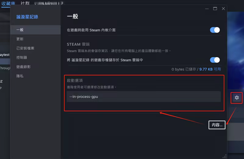 2. 粘貼至 收藏庫>謐漩星記錄>管理>内容…>啓動選項中(如圖所示)