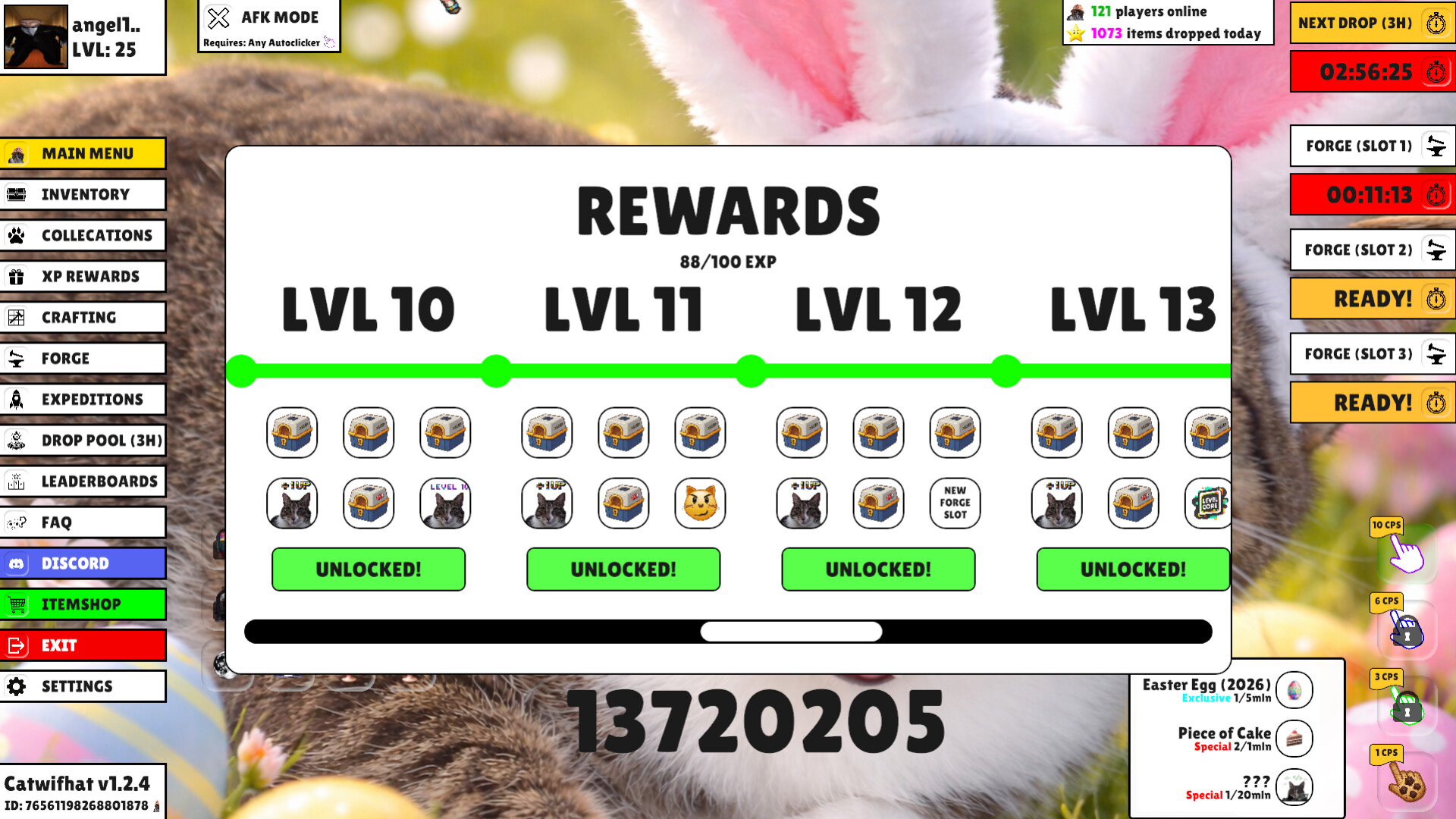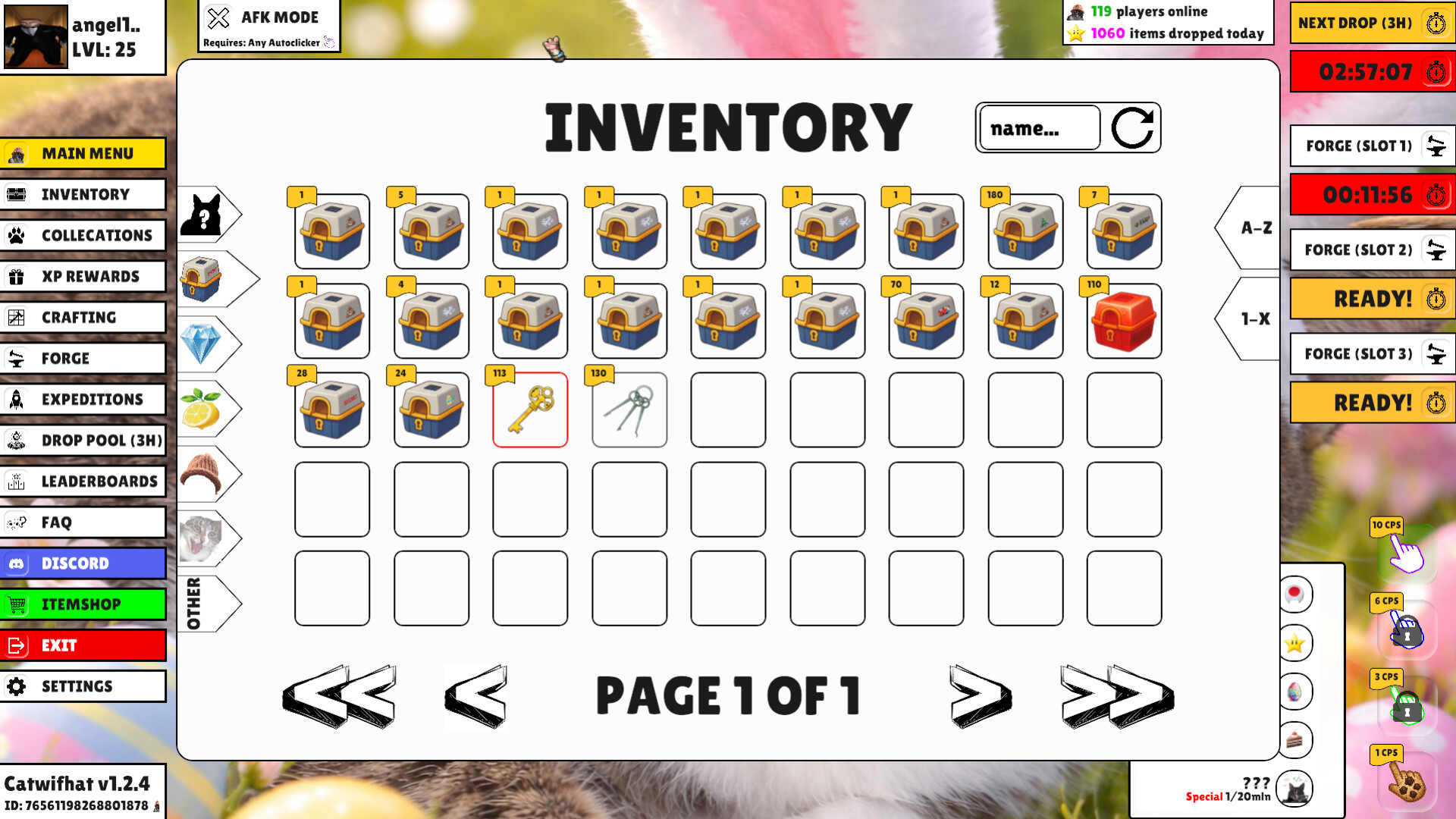 By clicking on adorable cats in hats, every click has a chance to drop loot — including ultra-rare items with odds as low as 1 in 1,000,000 per click. You can play actively or leave the game running AFK and see what drops over time.
