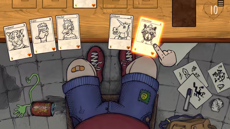 TCA is a political, humorous card adventure game with charm. Discover the atmospheric (ballpoint pen) hand-drawn world and its inhabitants and collect lots of cards in the process!