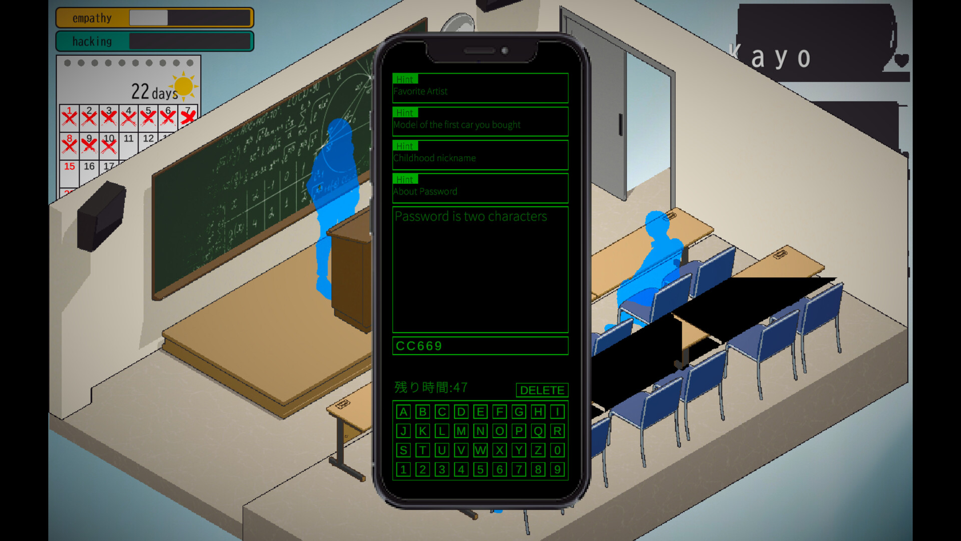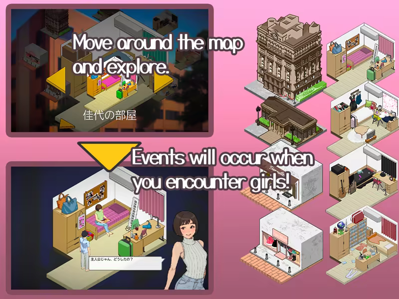 This is a romance simulation game that progresses with just a click. You can choose where to go from the protagonist's dorm room and move around the map. By checking social media, you can try to encounter the girls and get closer to them emotionally. Attending classes will earn you experience points, which can be used to acquire special skills. These skills allow you to see the affection levels of the girls or hack into their private social media accounts to gain deeper insights.