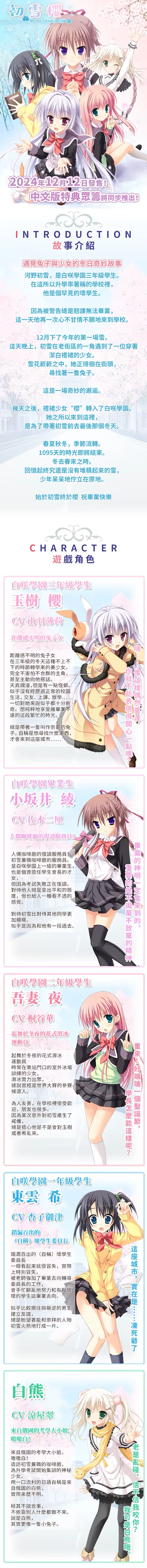 《初雪櫻》多年來人氣經久不衰。除曾在美少女遊戲大賞中榮獲綜合第1、劇本第1、音樂第1,玉樹櫻和小坂井綾分獲角色第2和第7等諸多獎項外,也曾陸續推出過PSV、PS4、iOS、Android和NS版本。國際中文版現正銳意製作中,我們也將推出本作的中文版特典活動。敬請期待。