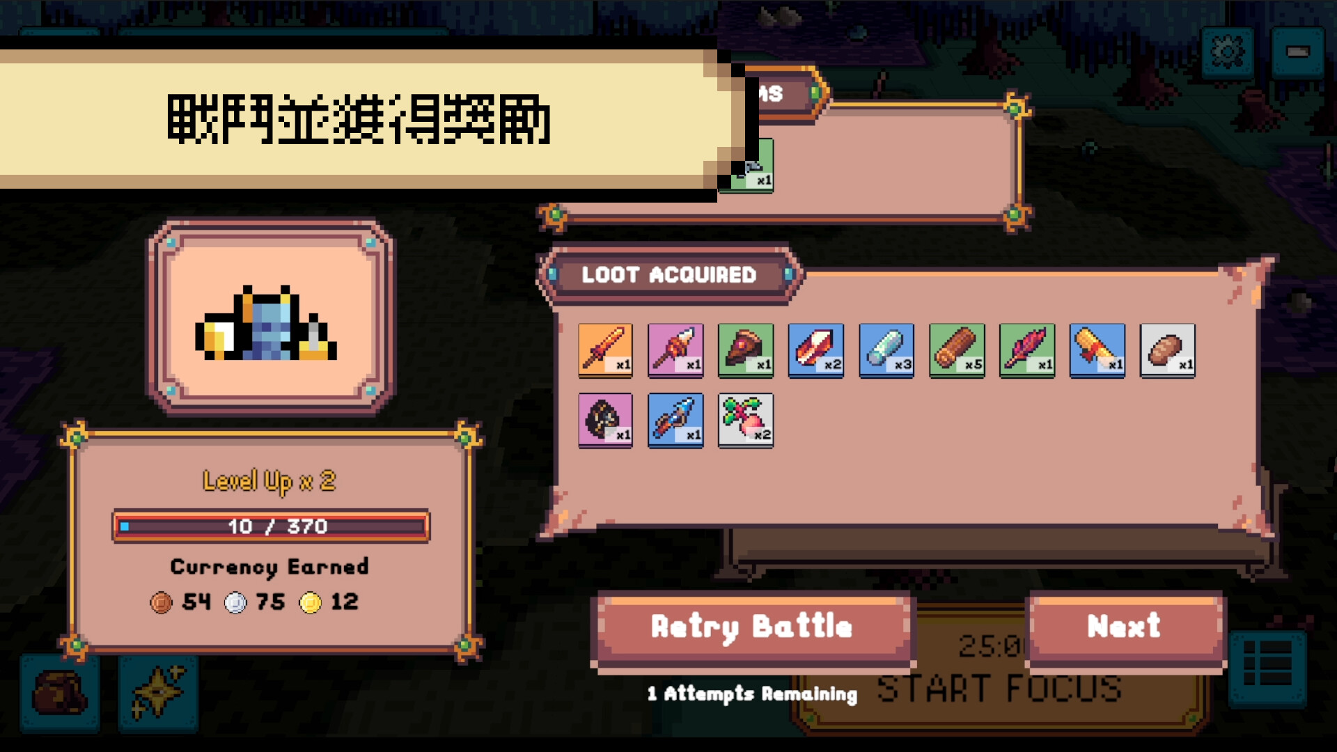 • 番茄鐘專注結束,進入休息階段時,角色會觸發包括戰鬥等不同的事件。事件過後會獲得各種獎勵。