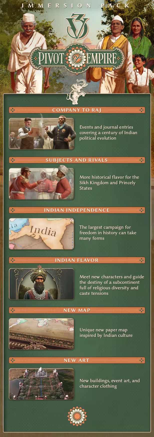 • Use the new Harvest and Famines mechanics to secure India's food supply, taking advantage of the unique events and narrative content