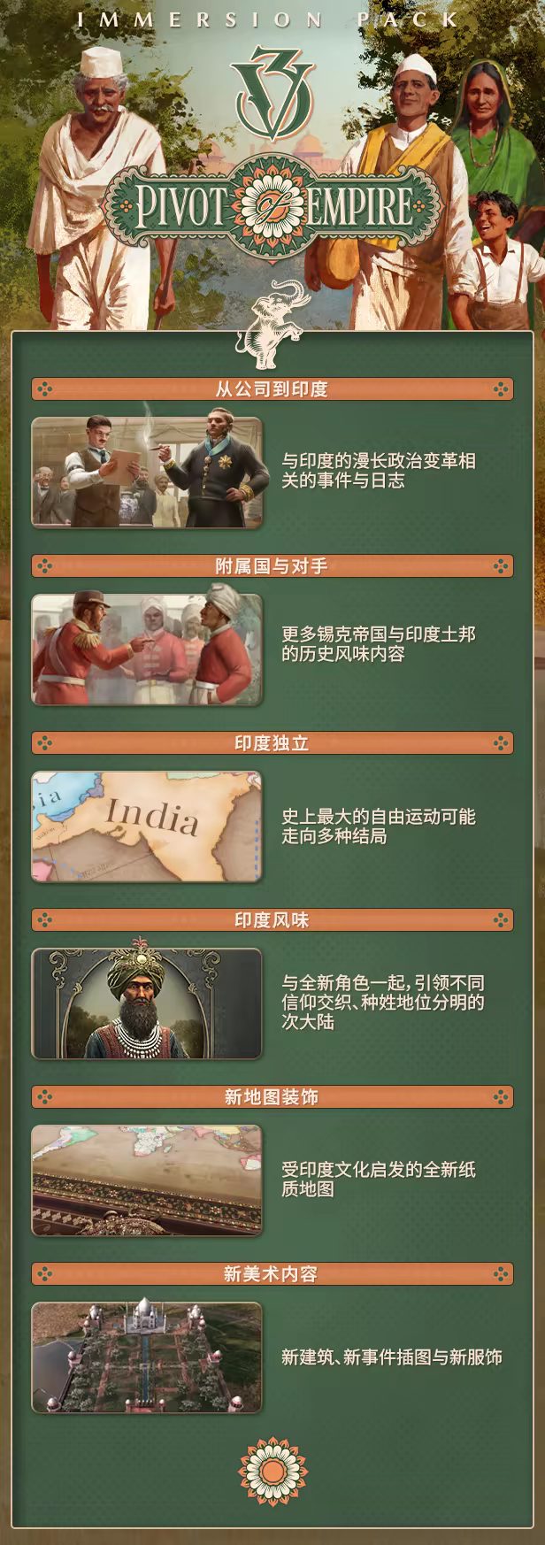 Pivot of Empire聚焦于这一时期印度的社会演变,从私营企业政府到独立运动的开始。当变革的浪潮围绕着皇冠上的明珠开始涌动,引导印度次大陆的各种文化走向繁荣,并有可能走向自由。领导印度人民实现自治,走向全球命运,或者维持现状,成为世界上最强大帝国的核心。
