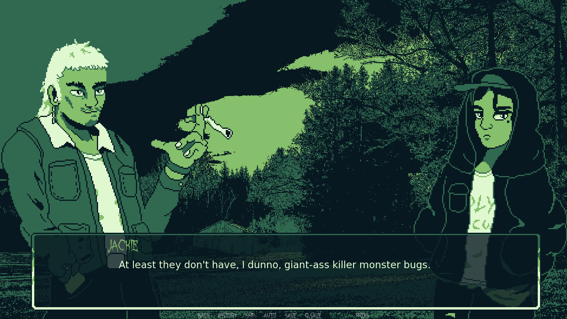 Brood Year is a slasher-mystery horror with dynamic choices, changing story-lines and endings depending on the player's choices. Drawn in a dark pixel-punk style evocative of retro-adventure games, it is fully animated from scenes to character sprites. Written as a horror short film, multiple playthroughs are required to uncover all potential routes.