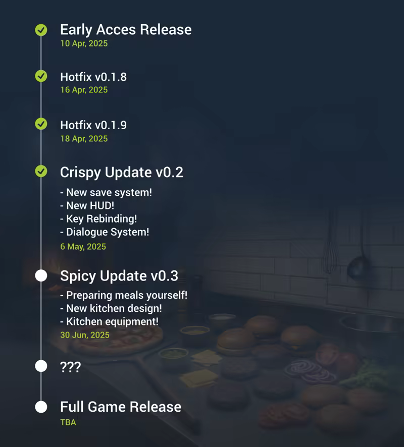 “We plan to feature a wider range of meal and ingredient options, a more dynamic customer experience with deeper interactions, and more extensive customization options for your restaurant. We also plan to add features like advanced staff management systems, new restaurant upgrades, and more detailed financial simulations. While we are excited to expand the scope of the game, we are focused on refining the current features during Early Access based on community feedback.”