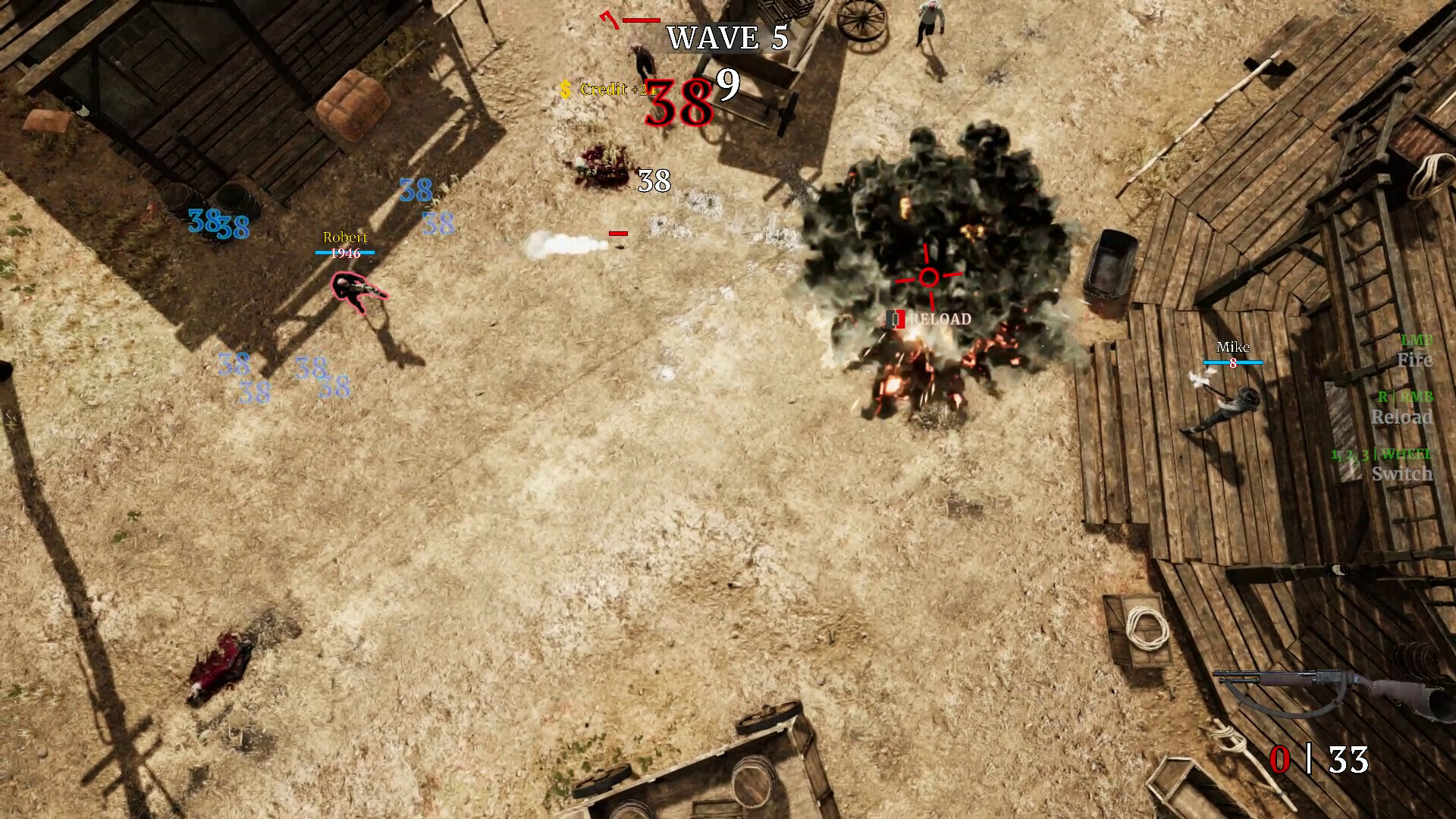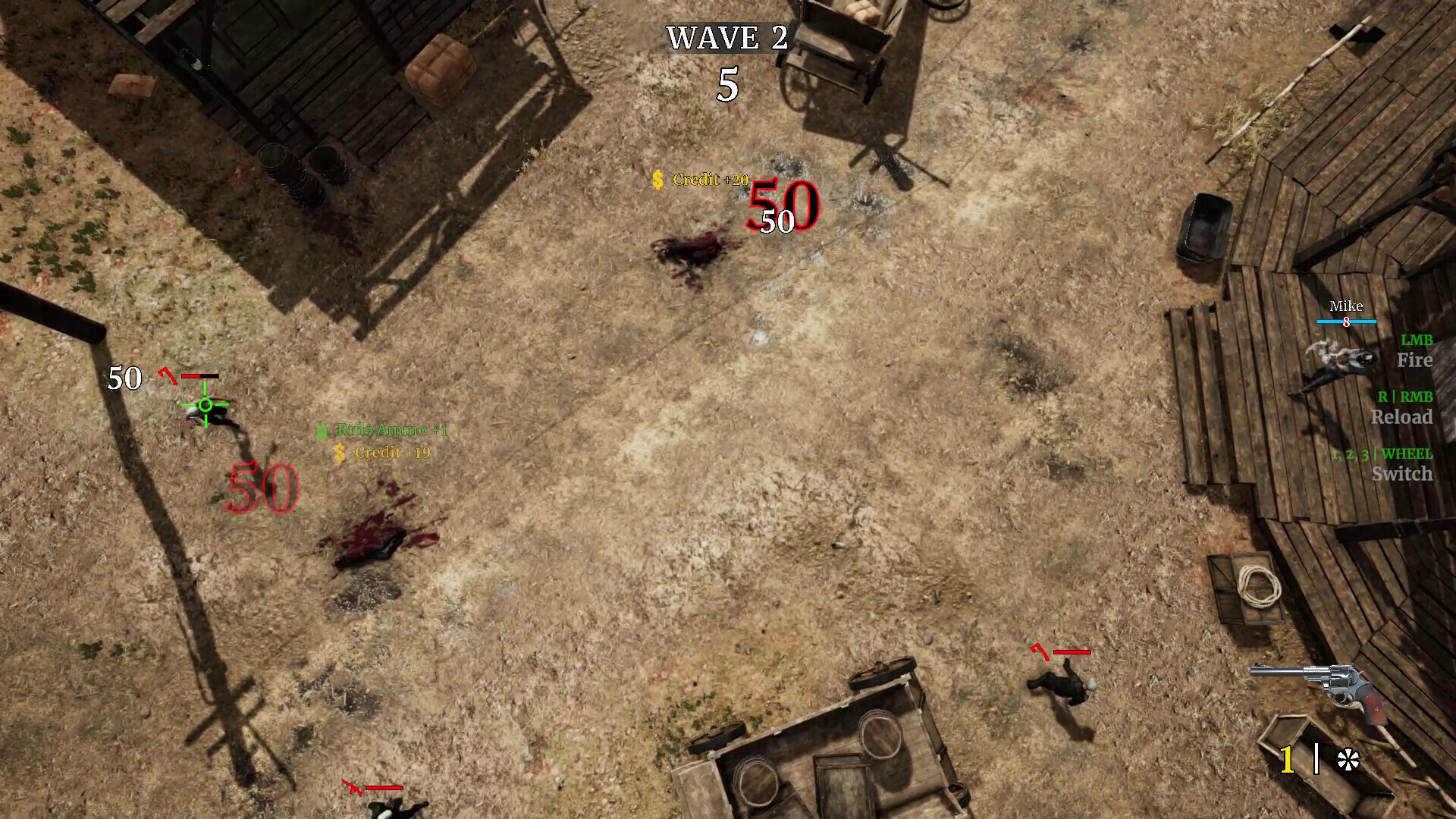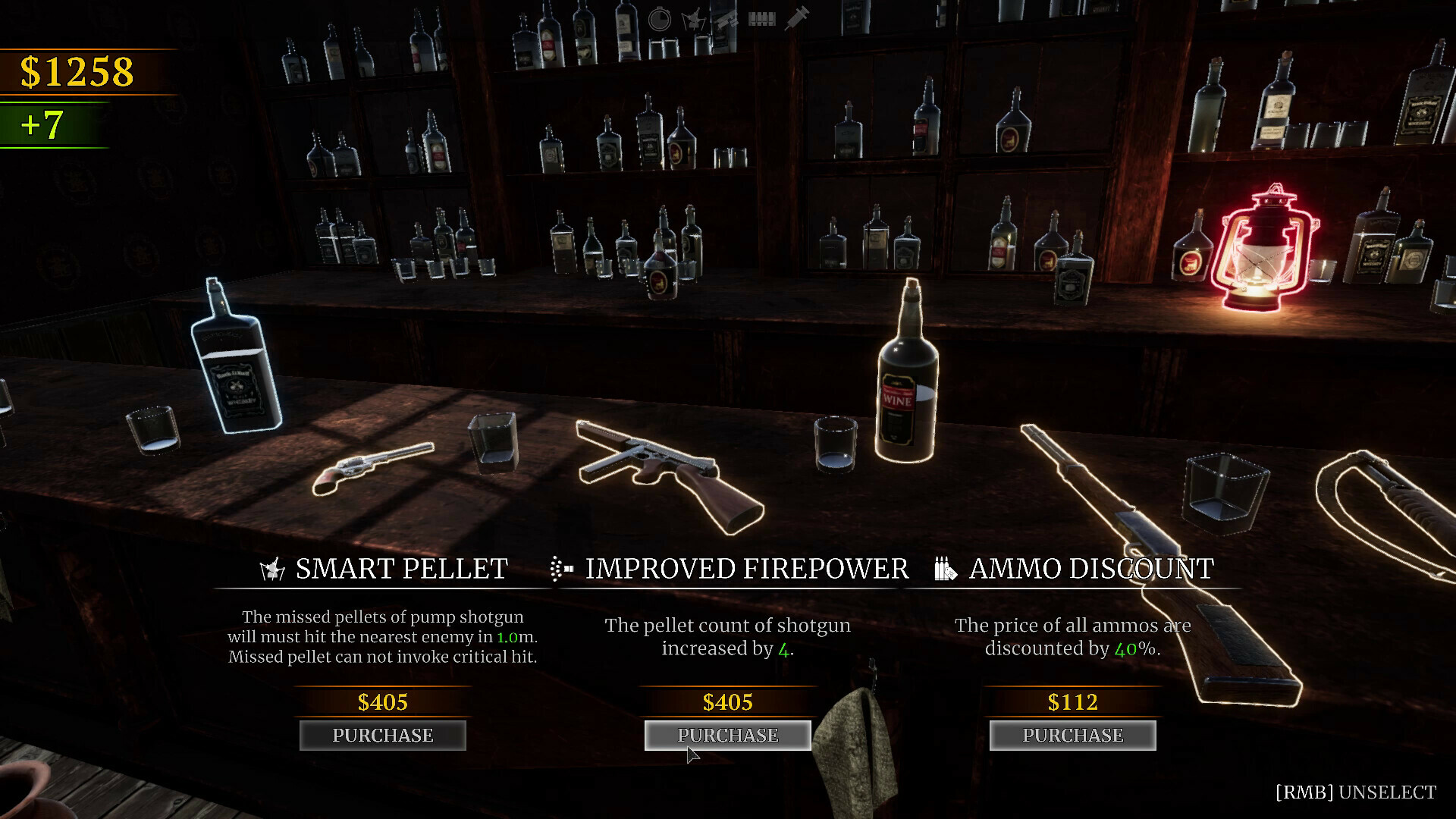 • After wave end, moving to saloon. You can use the credits to buy ability, upgrade the weapons and recover the health