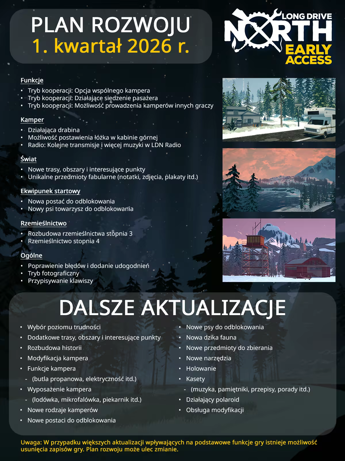 „Zgodnie z naszym planem pełna wersja gry będzie zawierać zaawansowane systemy konserwacji/naprawy kampera i przetrwania w dziczy. Chcemy także dodać więcej zwierząt łowieckich i przepisów kulinarnych. Dodatkowo podczas wczesnego dostępu zamierzamy bardziej dopracować produkcję i ją zoptymalizować. Opinia społeczności i jej sugestie są dla nas bardzo ważne – staną się częścią naszych planów aktualizacji do Long Drive North.”