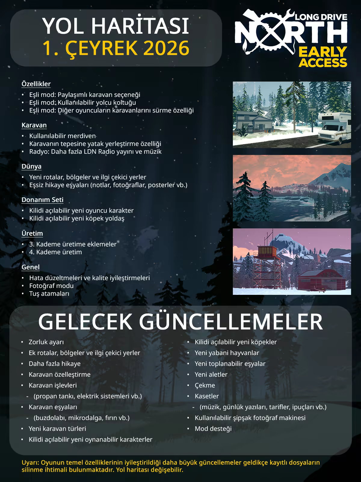 "Tam sürümü planlama aşamasındayız. Gelişmiş karavan bakımı/tamiri ve hayatta kalma sistemleri gibi özellikler eklemeyi planlıyoruz. Ayrıca avlanacak daha çok yabani hayvan ve pişirilecek daha çok yemek tarifi de planlarımız arasında. Bunlara ek olarak Erken Erişim süresince iyileştirmeler ve optimizasyonlar yapmayı hedefliyoruz. Daha da önemlisi topluluğumuzun geri bildirimlerinin ve görüşlerinin de Long Drive North için güncelleme planlarımıza katkısı olacak."