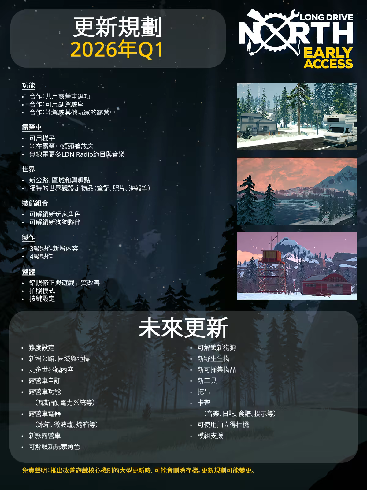「我們正在計劃製作完整的遊戲,包括增強的房車維護/修理與生存系統。我們還計劃增加更多野生生物供狩獵以及更多食譜供烹飪。此外,我們計劃在整個搶先體驗階段提升遊戲的完善度以及最佳化。重要的是,社群回饋與建議也將成為我們《Long Drive North》更新計畫的一部分。」