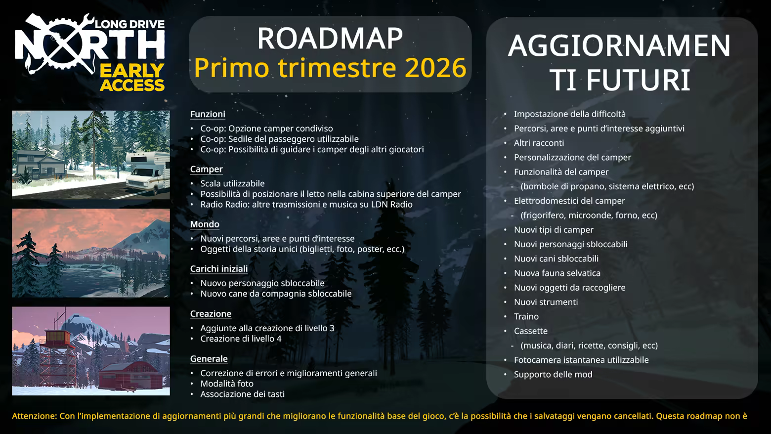 “Stimiamo che Long Drive North resterà in accesso anticipato per 18-24 mesi, in base al feedback e ai suggerimenti della community.”