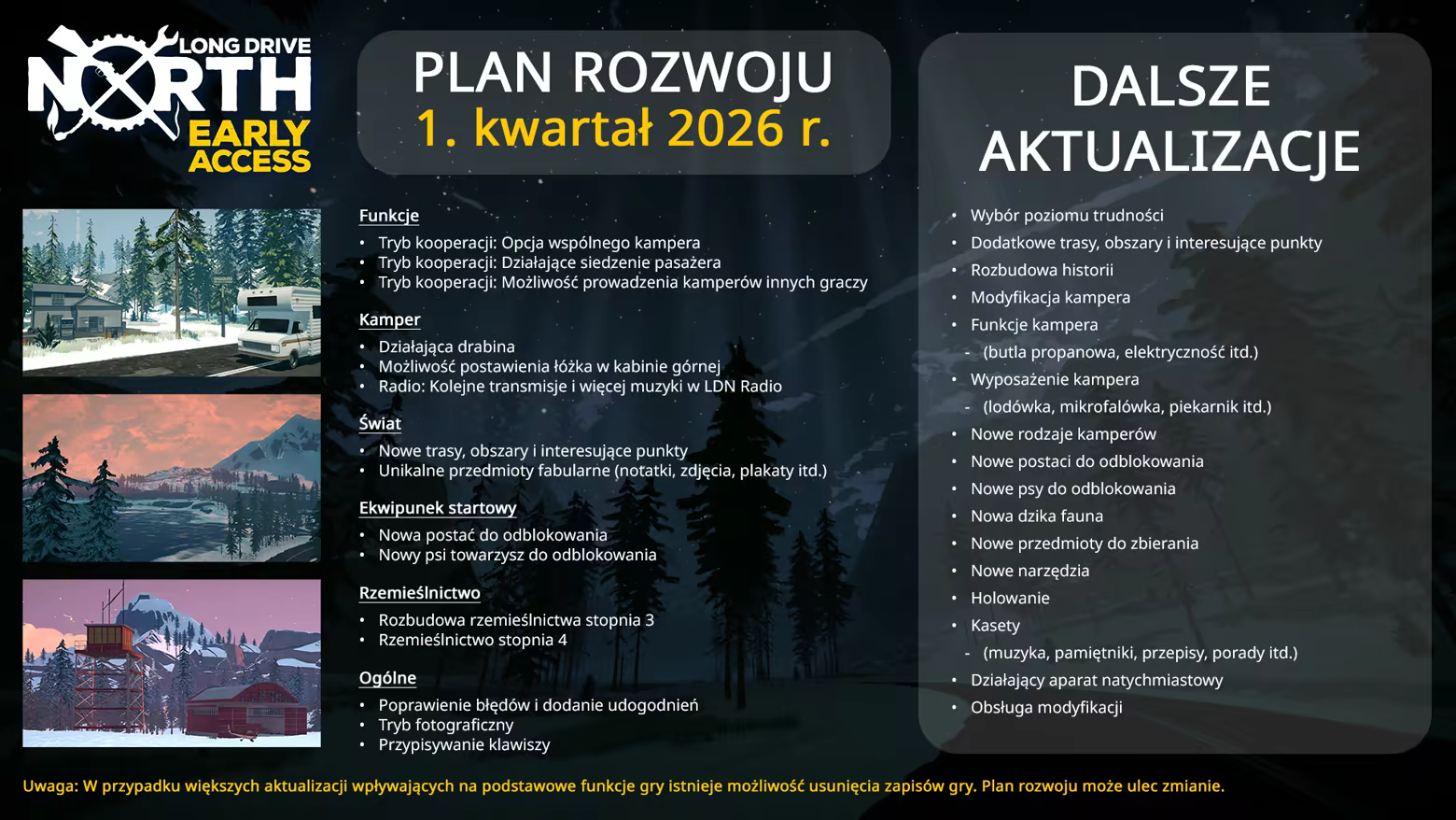 „Zgodnie z naszym planem pełna wersja gry będzie zawierać zaawansowane systemy konserwacji/naprawy kampera i przetrwania w dziczy. Chcemy także dodać więcej zwierząt łowieckich i przepisów kulinarnych. Dodatkowo podczas wczesnego dostępu zamierzamy bardziej dopracować produkcję i ją zoptymalizować. Opinia społeczności i jej sugestie są dla nas bardzo ważne – staną się częścią naszych planów aktualizacji do Long Drive North.”