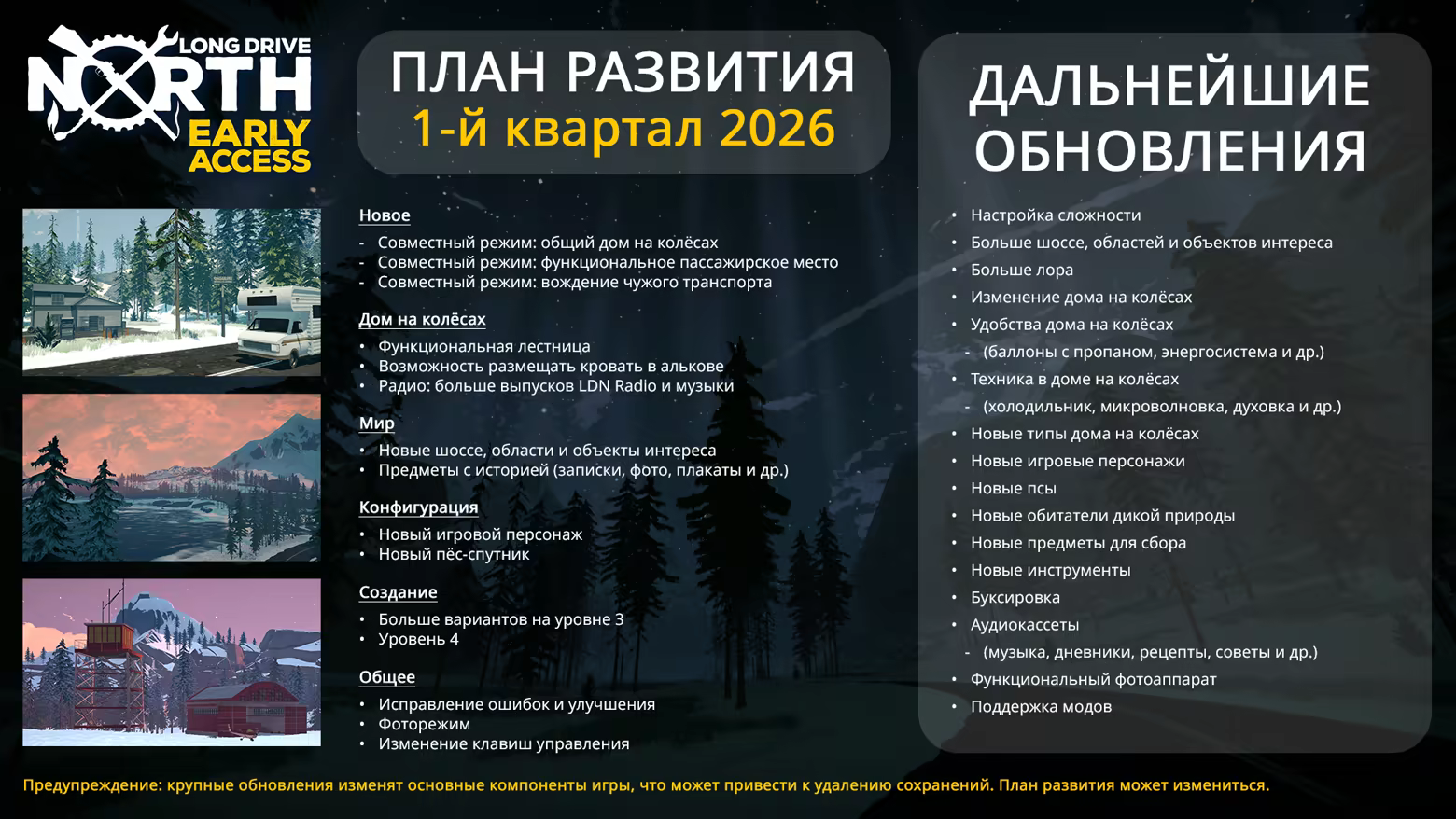 «В полной версии игры будут представлены улучшенные системы выживания, а также поддержания и ремонта дома на колесах. Мы планируем добавить больше дичи для охоты и новые рецепты для готовки. Также в ходе раннего доступа мы намерены доработать различные функции и улучшить оптимизацию. Отзывы и предложения сообщества будут играть немаловажную роль в планах дальнейшей разработки и обновлений Long Drive North.»