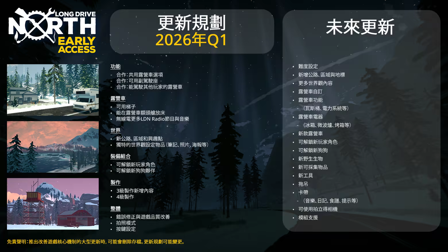 「我們正在計劃製作完整的遊戲,包括增強的房車維護/修理與生存系統。我們還計劃增加更多野生生物供狩獵以及更多食譜供烹飪。此外,我們計劃在整個搶先體驗階段提升遊戲的完善度以及最佳化。重要的是,社群回饋與建議也將成為我們《Long Drive North》更新計畫的一部分。」
